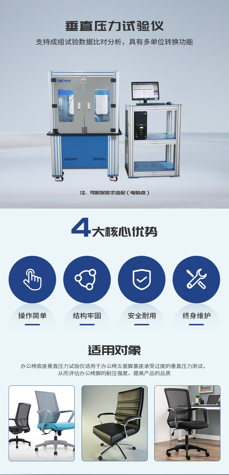 辦公椅垂直壓力試驗機F733-2也叫“五腳靜壓試驗機”,用于辦公椅五爪抗壓垂直壓力測試,本機也可作為疲勞測試使用,在設定力值,測試周期內,反復加載壓力作為疲勞測試。壓力大小,持壓時間和循環測試次數均可調。