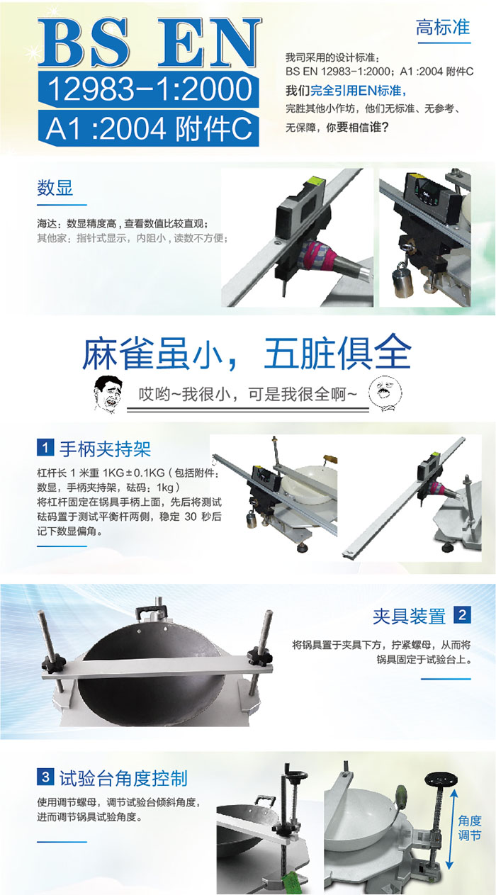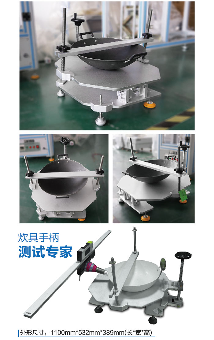 把試樣固定在測試平臺上,調(diào)節(jié)緊固裝置的角度,使連接炊具手柄的平衡桿達(dá)到水平,同時(shí)指針指向分度表的零位。把測試砝碼分別懸掛于平衡桿的一端并保持靜止30s,角度尺記錄平衡桿偏轉(zhuǎn)的角度,檢查手柄和連接部件,記錄試樣的損壞情況。