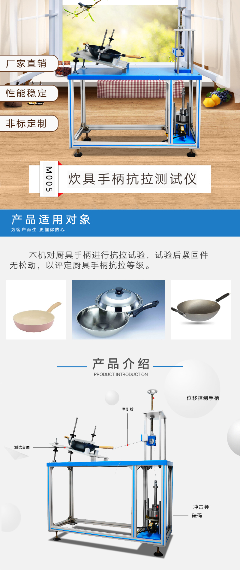 炊具手柄抗拉測試對廚具手柄進行抗拉試驗,試驗后緊固件無松動, 以評定廚具手柄抗拉等級。