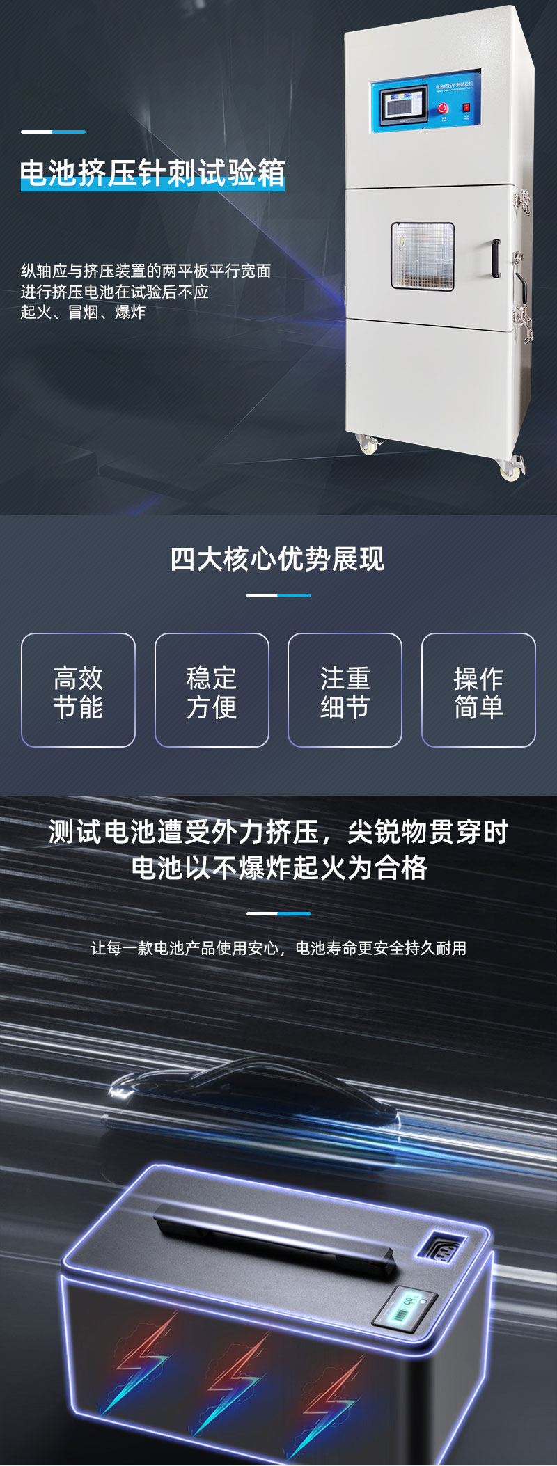 H212電池擠壓針刺試驗箱適用于模擬各類電池在使用,運輸,儲存或處理家庭廢物時,電池遭受擠壓和針刺的情形,試驗應在20℃±5℃的環境溫度下進行,將接有熱電偶的電池(熱電偶的觸點固定在電池大表面上)置于通風櫥中,用直徑2-8mm的無蝕銹鋼針以25mm/s的速度刺穿電池最大表面的中心位置,保持任意時間并觀察其測試結果,電池不爆炸、不起火為合格。