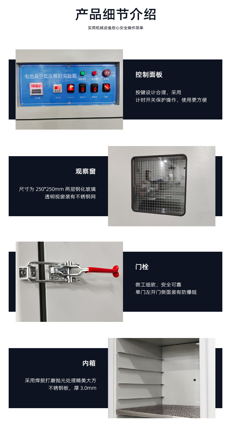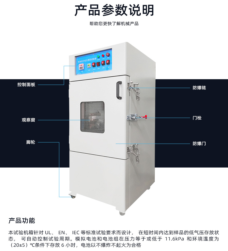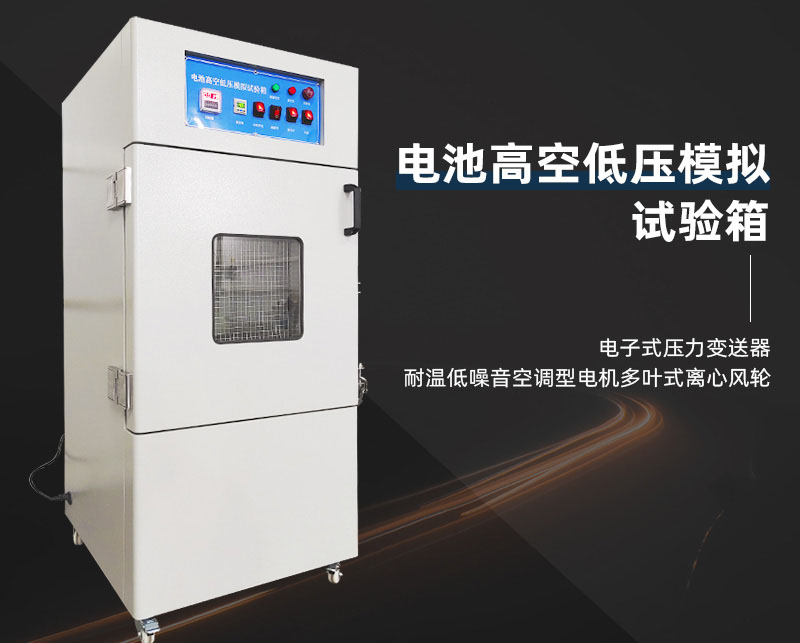 電池高空低壓模擬試驗箱針對UL、EN、IEC等標準試驗要求而設計,在短時間內達到樣品的低氣壓存放狀態,可自動控制試驗周期,全程監控箱內氣壓變化,實現試驗的自動終止。