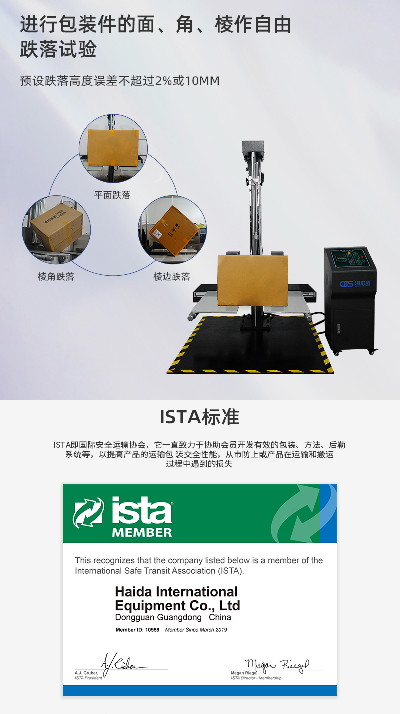 跌落試驗機專用于測試產品包裝受到墜落之受損情況,及評估運輸搬運過程時耐沖擊強度。采用雙柱導向、 高度跌落次數可置,工作穩定可靠,可實現棱、面、角跌落,滿足GB/T4857.5-92、ISO2248-1972E。采用光 電控制,可設定七檔跌落高度,也可自由選擇跌落高度,跌落釋放采用電磁控制,能使試樣瞬間自由落下, 對包裝容器進行之棱、角、平面進行跌落沖擊試驗。