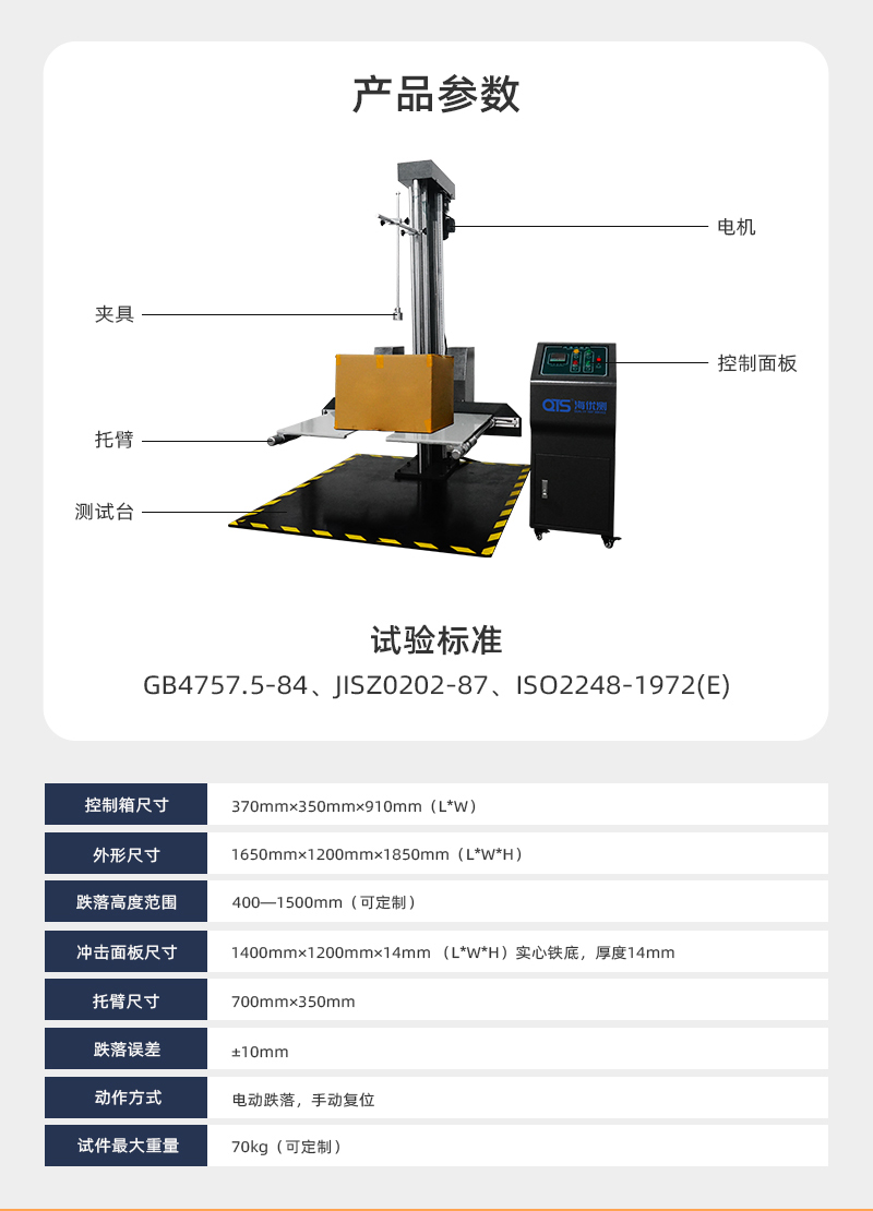 跌落試驗機專用于測試產品包裝受到墜落之受損情況,及評估運輸搬運過程時耐沖擊強度。采用雙柱導向、?高度跌落次數可置,工作穩定可靠,可實現棱、面、角跌落