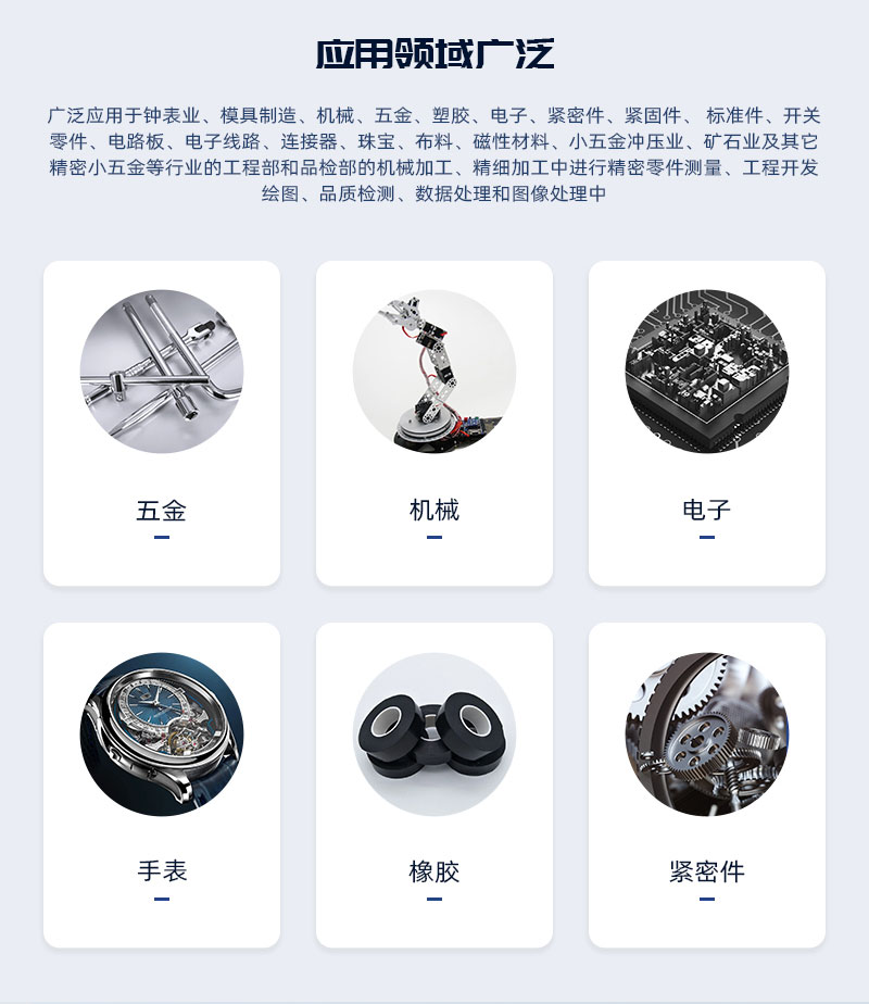 2 5次元自動影像測量儀廣泛應用于飛機小零件,航天研究所,航天標準件,軍工異形小件、計量院,導電粒子、沖壓產(chǎn)品、塑膠產(chǎn)品、汽車配件、醫(yī)療器械、計量院、高等院校等領域。