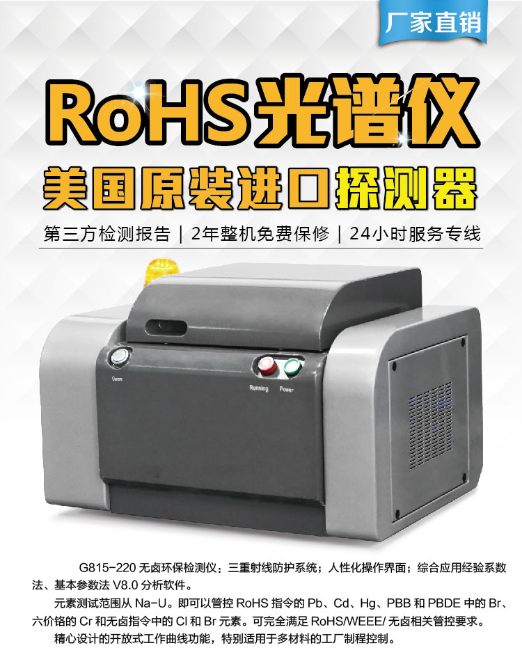 具有三重射線防護系統;人性化操作界面;綜合應用經驗系數法、基本參數法V8.0分析軟件。元素測試范圍從Na-U。即可以管控RoHS指令的Pb、Cd、Hg、PBB和PBDE中的Br、六價鉻的Cr和無鹵指令中的Cl和Br元素。可完全滿足RoHS/WEEE/無鹵相關管控要求。精心設計的開放式工作曲線功能,特別適用于多材料的工廠制程控制。