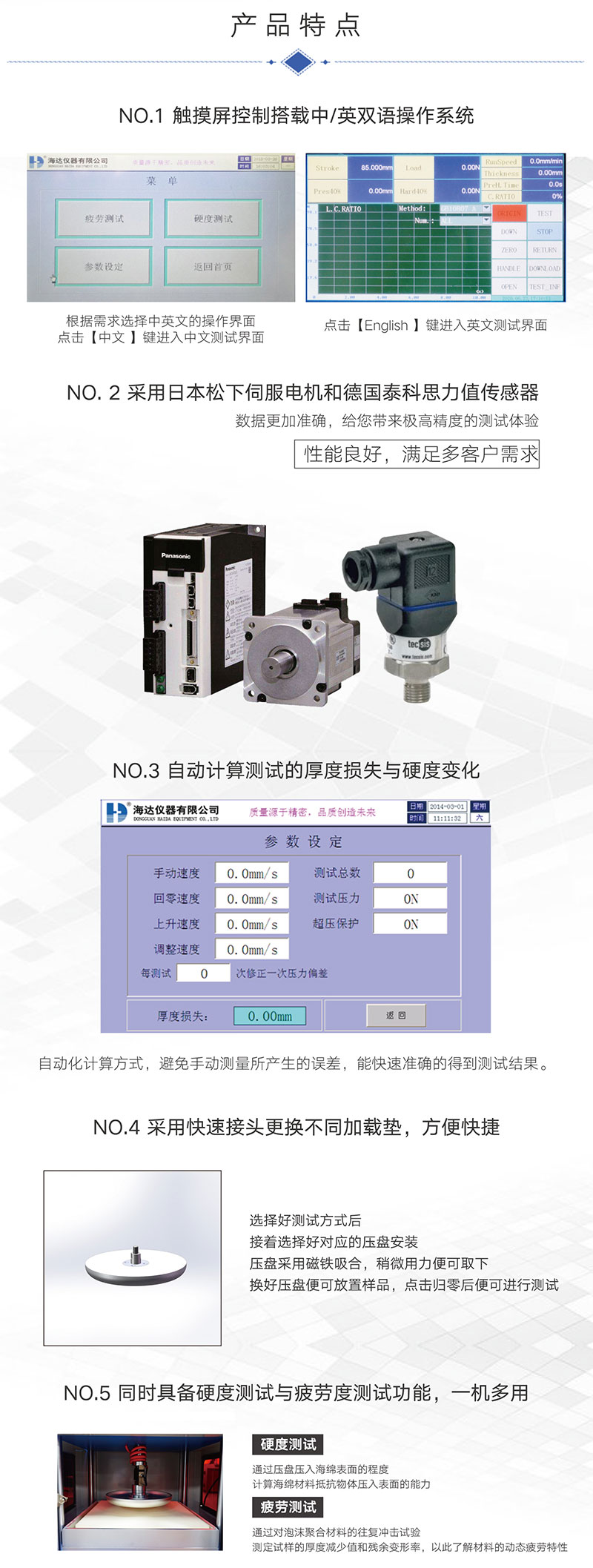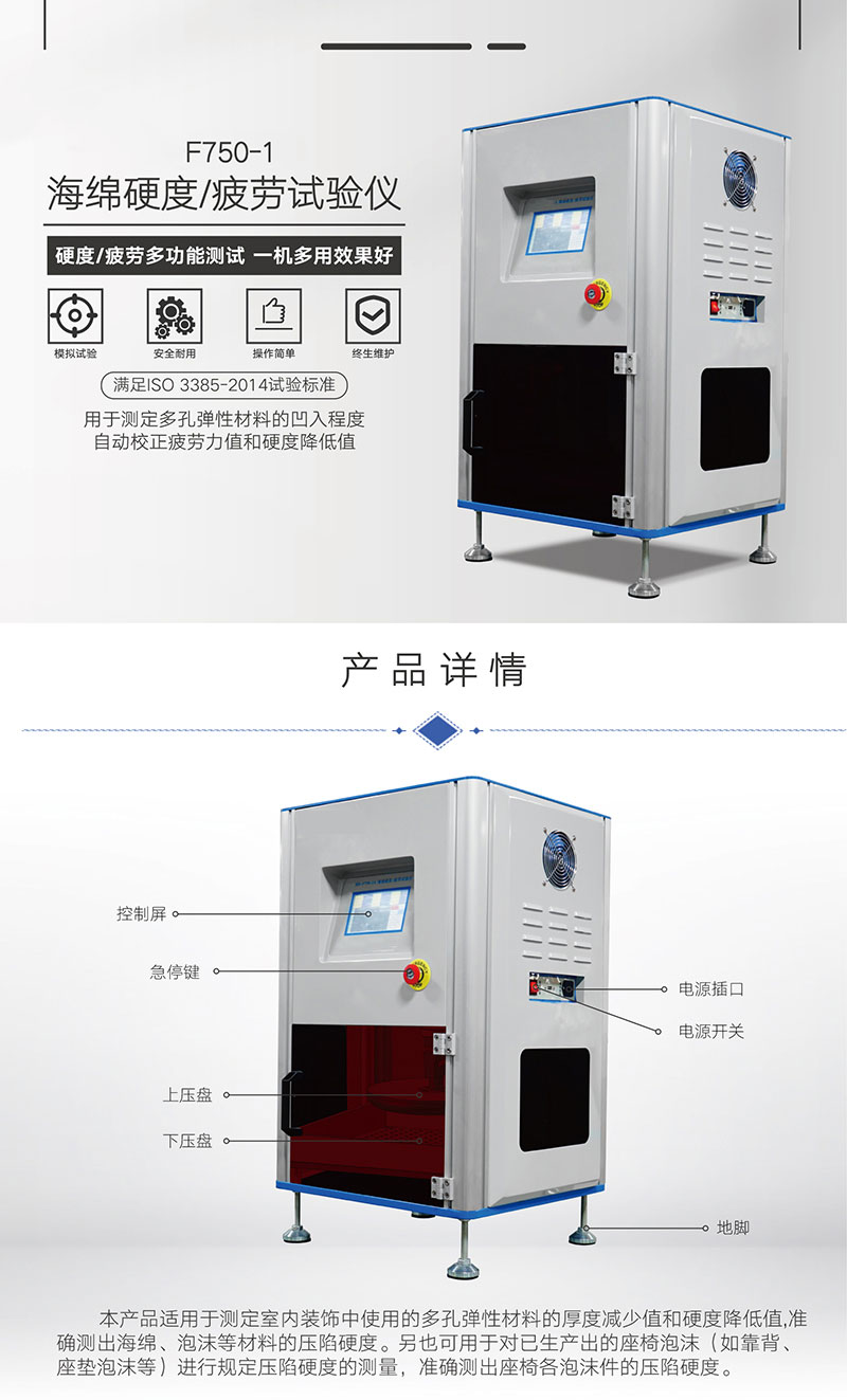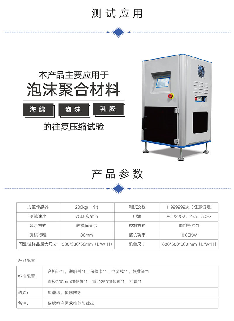 本機適用于測定軟質泡沫聚和材料,如:海綿、泡沫等,壓陷硬度是在國家標準要求的A法、B法、C法及其它試驗條件下對標準尺寸的海綿、泡沫等試樣進行標準的測試