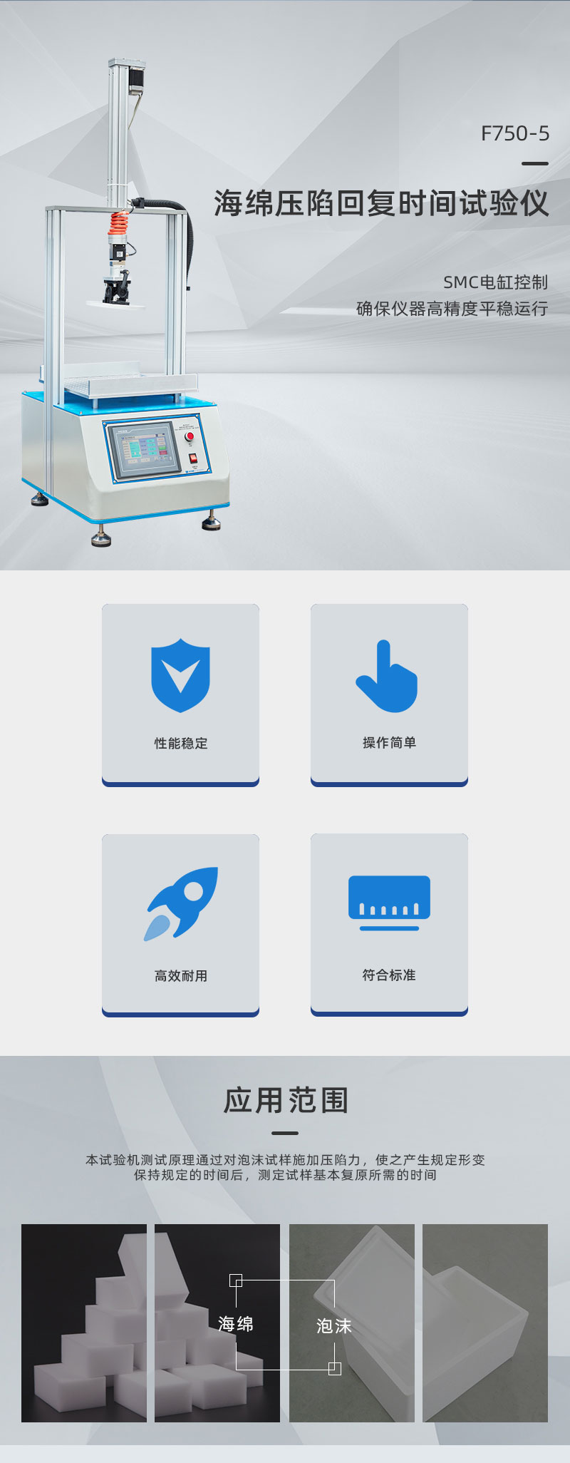 | 主要測試項(xiàng)目 | 海綿、泡沫試樣壓陷回復(fù)時(shí)間的測試 |