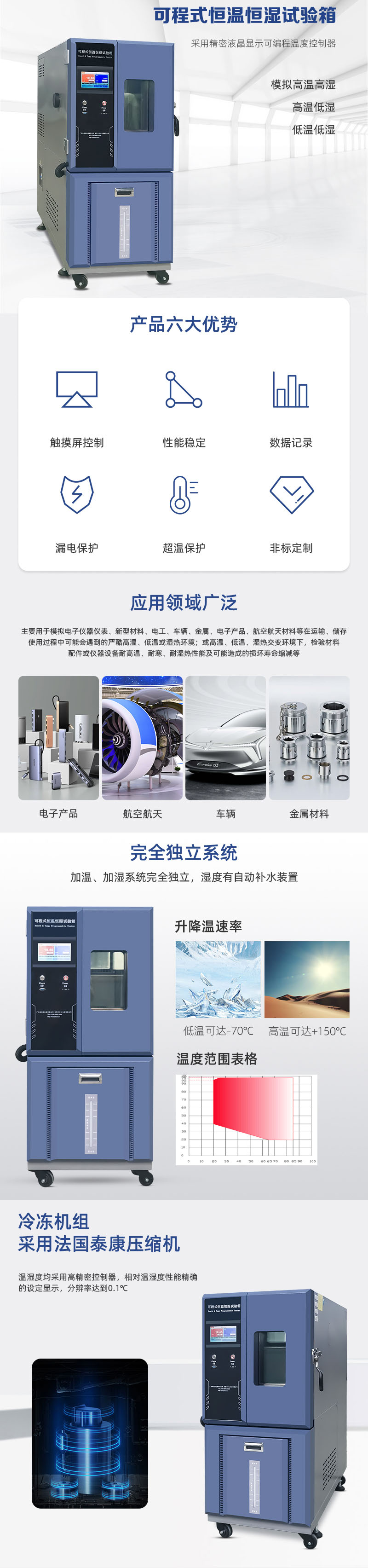 | 溫濕度范圍 | 0 ℃,-20 ℃,-40 ℃,-60 ℃,-70 ℃~150 ℃; 20%-98%R.H | |||