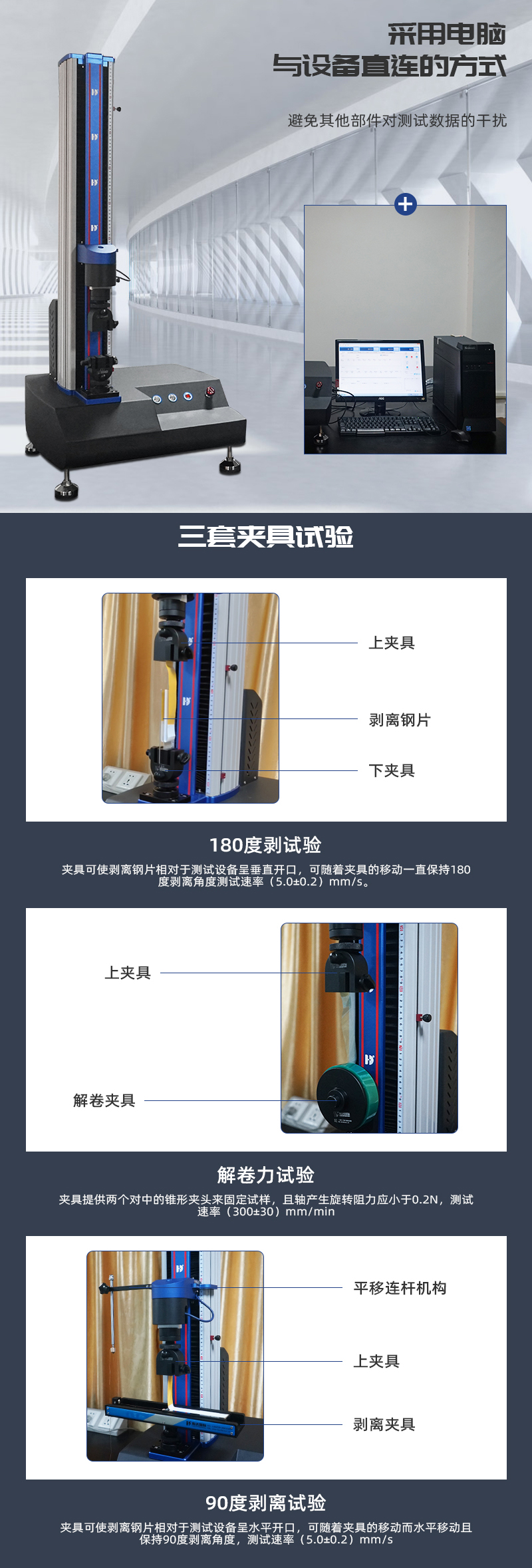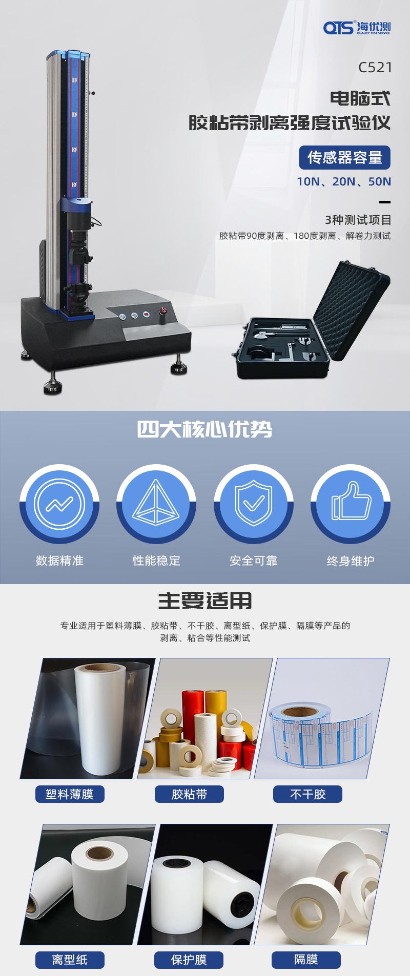 本機適用于塑料薄膜、復合材料、軟質包裝材料、塑料軟管、膠粘劑、膠粘帶、不干膠、金屬箔、無紡布、橡膠、紙張等產品的拉伸、剝離、變形、撕裂、粘合、穿刺力、開啟力等性能測試。