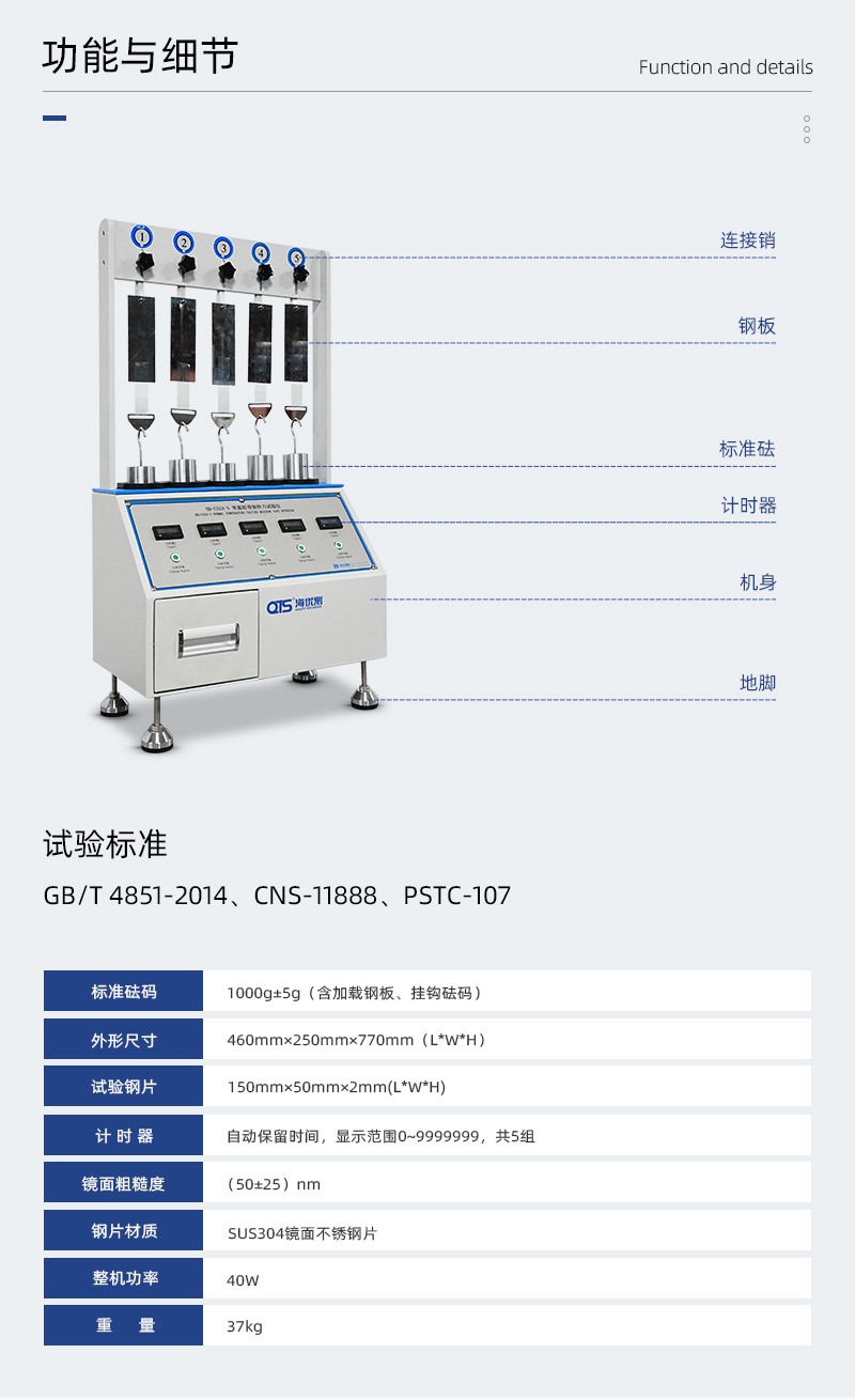 常溫型膠帶保持力試驗儀(5組)HD-C524將膠帶粘于測試鋼片上,下端懸掛標準荷重,經過一段時間后,測量膠帶下滑距離或膠帶粘著時間用來評定膠帶粘著的持久性。