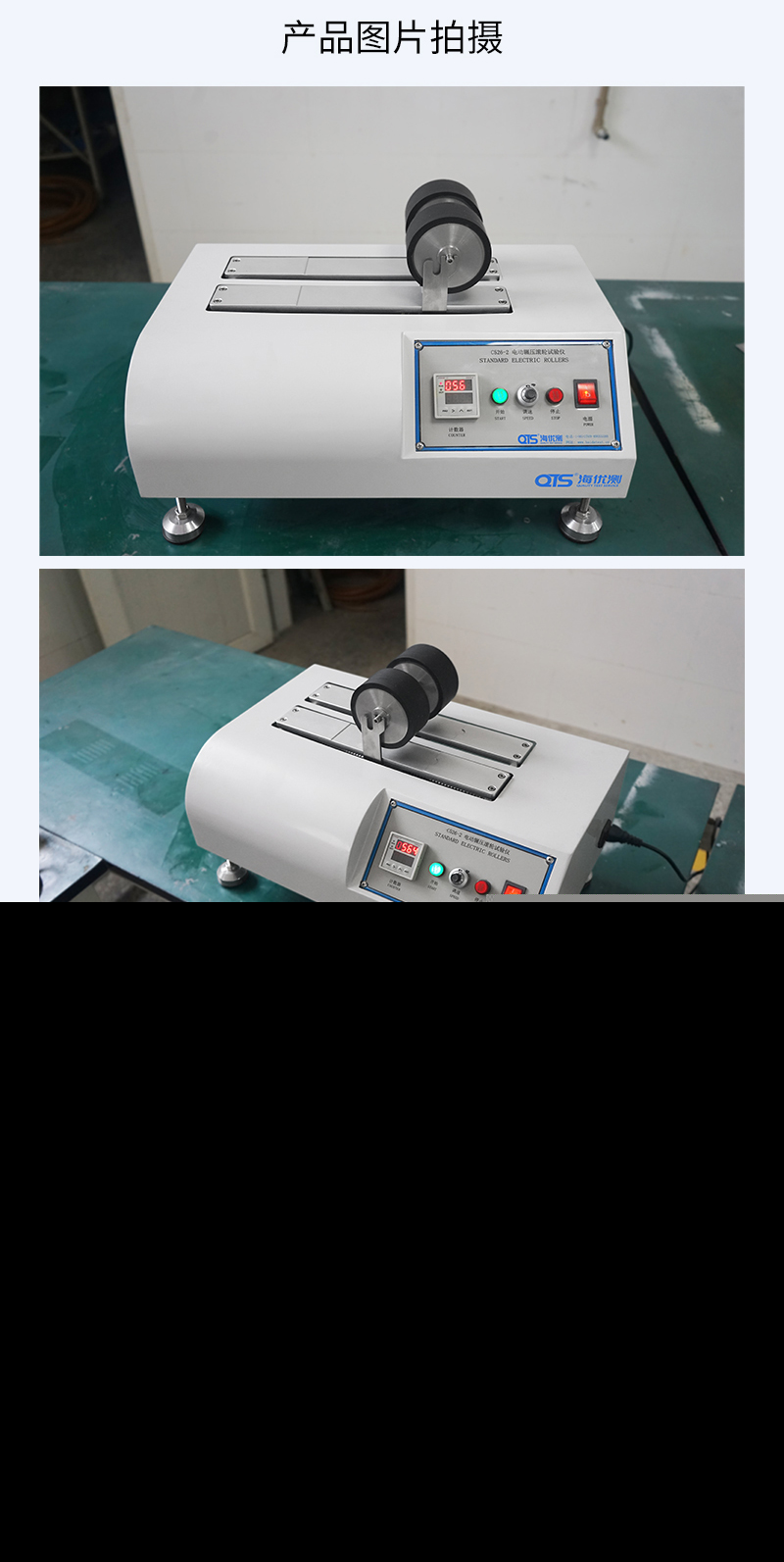 電動輾壓滾輪試驗機(雙滾)以壓輪本身之重量,輾壓膠帶試片,使試片能完全密合貼于試驗板上,以做為粘著保持力試驗之用。