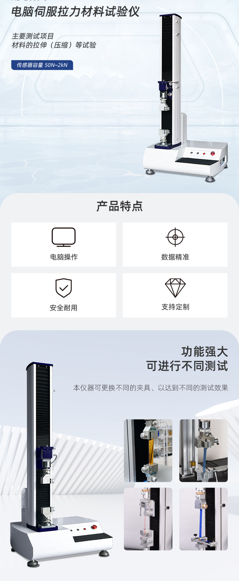 單柱電腦式拉力試驗機(jī)主要可測各種材料的拉力、剝離、撕裂、粘接力……抗力物性。可打印出測試日期、時間及顯示器設(shè)定的顯示值。可配各式夾具及伸長量測試裝置,或依據(jù)客戶需求定制。