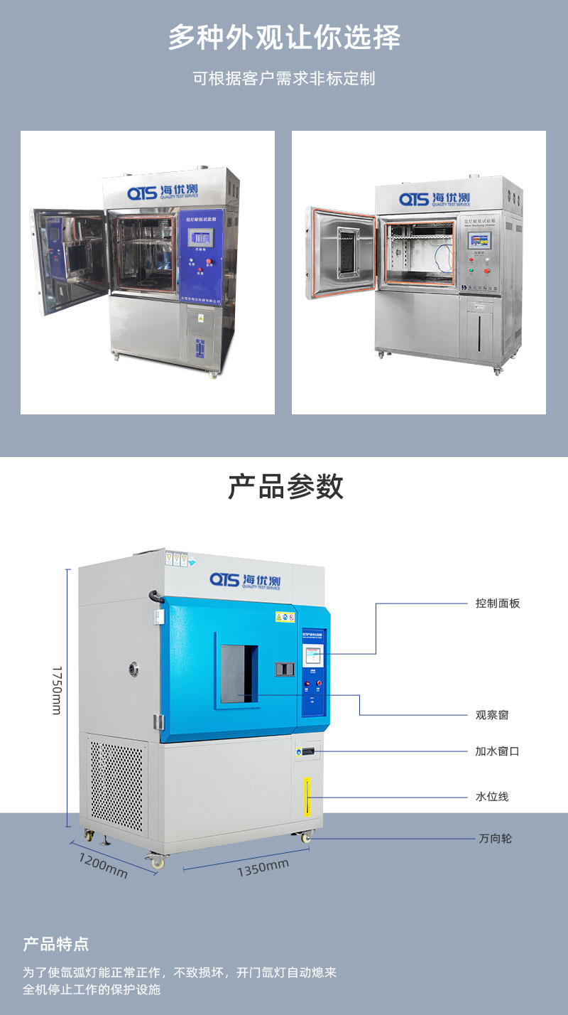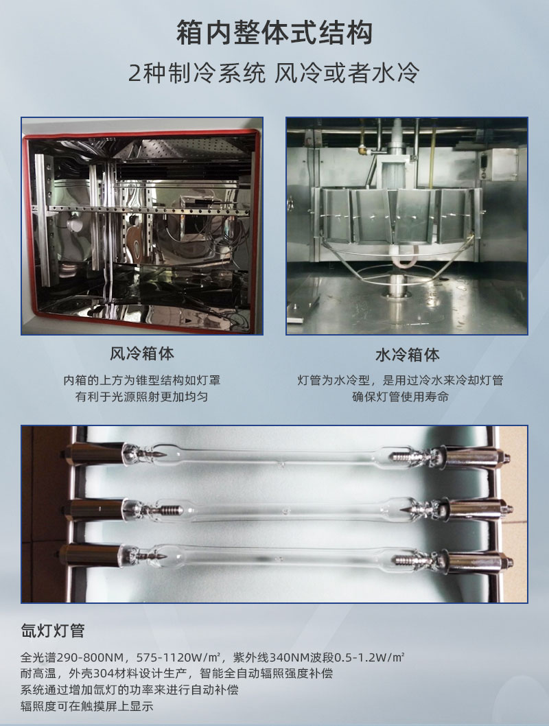 氙燈耐候試驗箱烤漆款模擬全陽光光譜的氙弧燈再現不同環境下存在的破壞性光波,、評估材料組成變化后耐用性的變化試驗,模擬在不同環境條件下,暴露在陽光下所產生的變化。