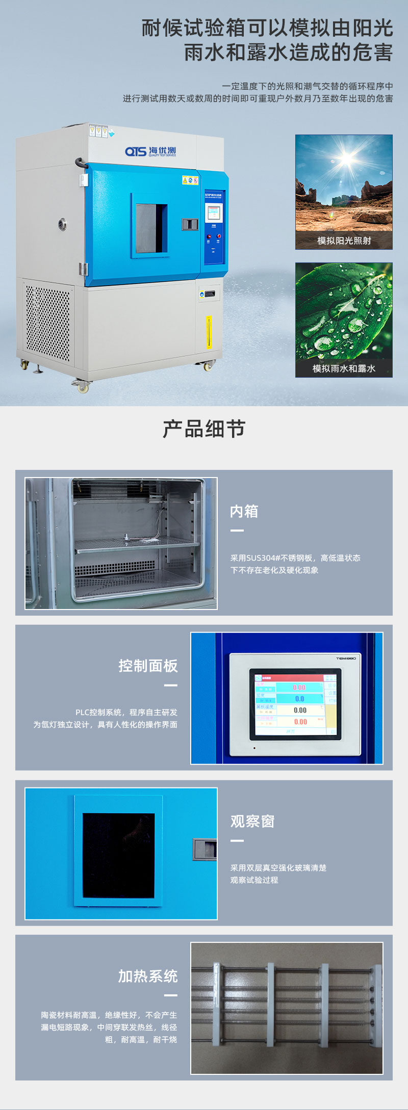 1. 滿足各種材料、半成品、成品,進行模擬大氣環境中,受陽紫外線照謝時的外觀變化,一般認為在50℃下測試9小時,理論上相當于暴露在大氣中6個月。