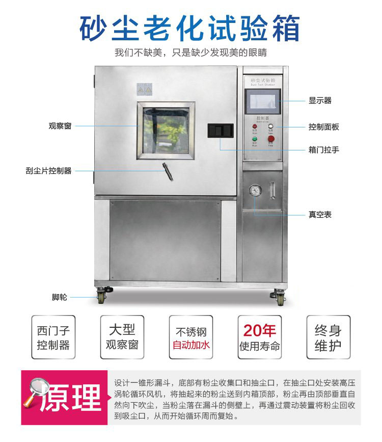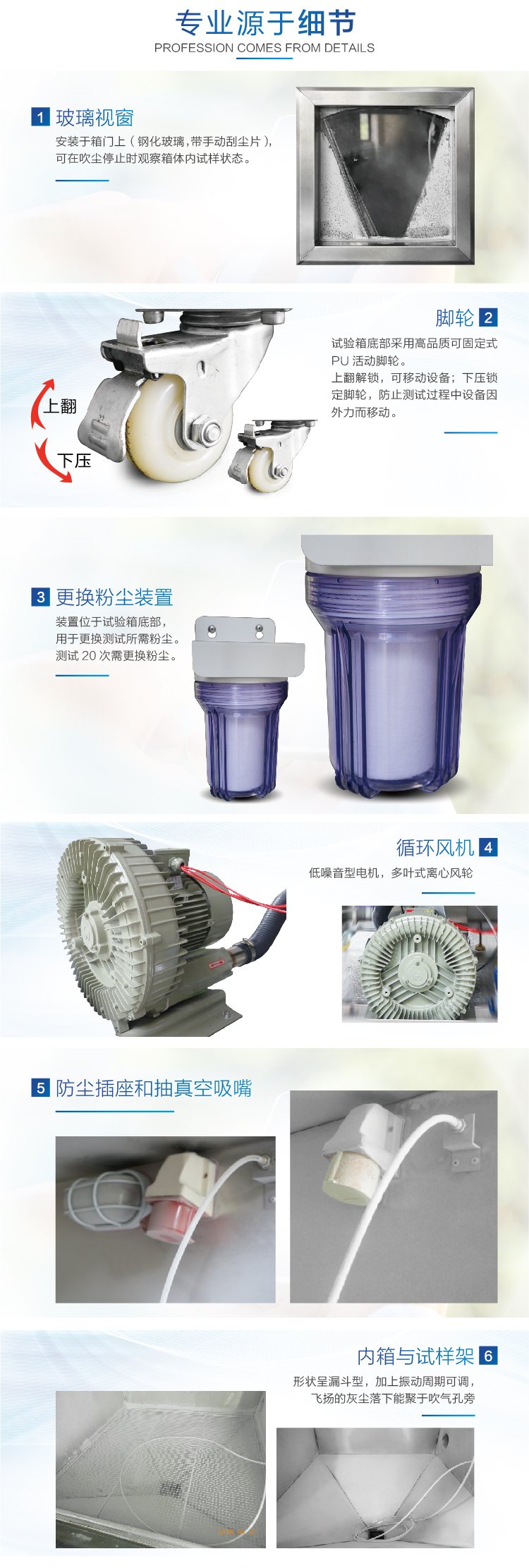 適用于檢測產品的外殼密封性能,主要用于外殼防護等級標準中規定的IP5X和IP6X兩個等級的試驗。主要是模擬沙塵暴天氣對鎖具、汽摩零部件、密封件、電力儀表等產品所造成的破壞。