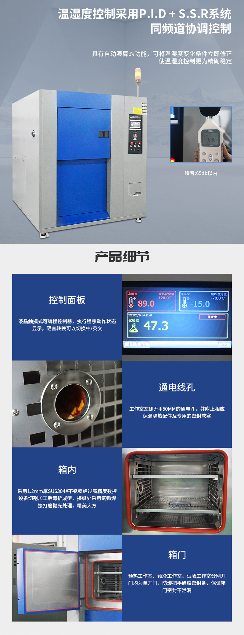 冷熱沖擊試驗箱是金屬、塑料、橡膠、電子等材料行業(航空、汽車、家電、科研等領域)必備的測試設備,用于測試材料結構或復合材料,在瞬間下經極高溫及極低溫的連續環境下忍受的程度,得以在短時間內檢測試樣因熱脹冷縮所引起的化學變化或物理傷害
