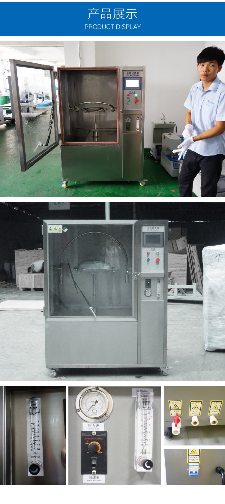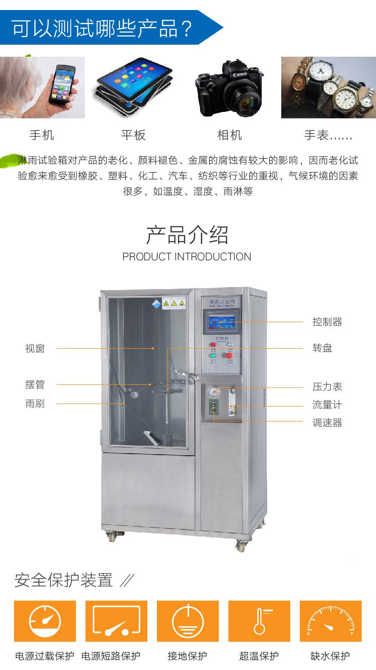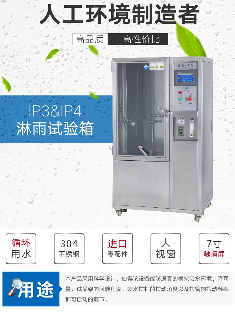 IPX3-4淋雨試驗箱適用于電工電子產品、材料、零部件等在淋雨、溫度條件下的適應性及可靠性試驗。也可用于外部照明和信號裝置及汽車燈具外殼防護。