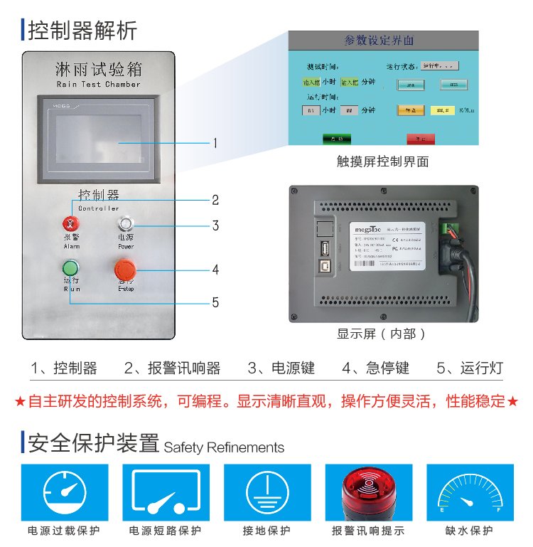 4. 淋雨時間、淋雨間隔時間、雨量強度分別調節與控制。