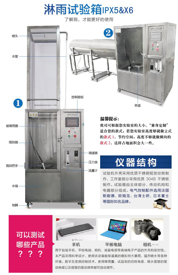 IPX5-6強噴水試驗機適用于測試產品在淋雨的氣候環境下的貯存、運輸和使用時的性能試驗,該設備主要用于對電工電子產品、燈具、電柜、電器元件、汽車、摩托車及其零部件等產品在模擬淋雨的氣候條件下,對產品的物理以及其它相關性能進行測試。