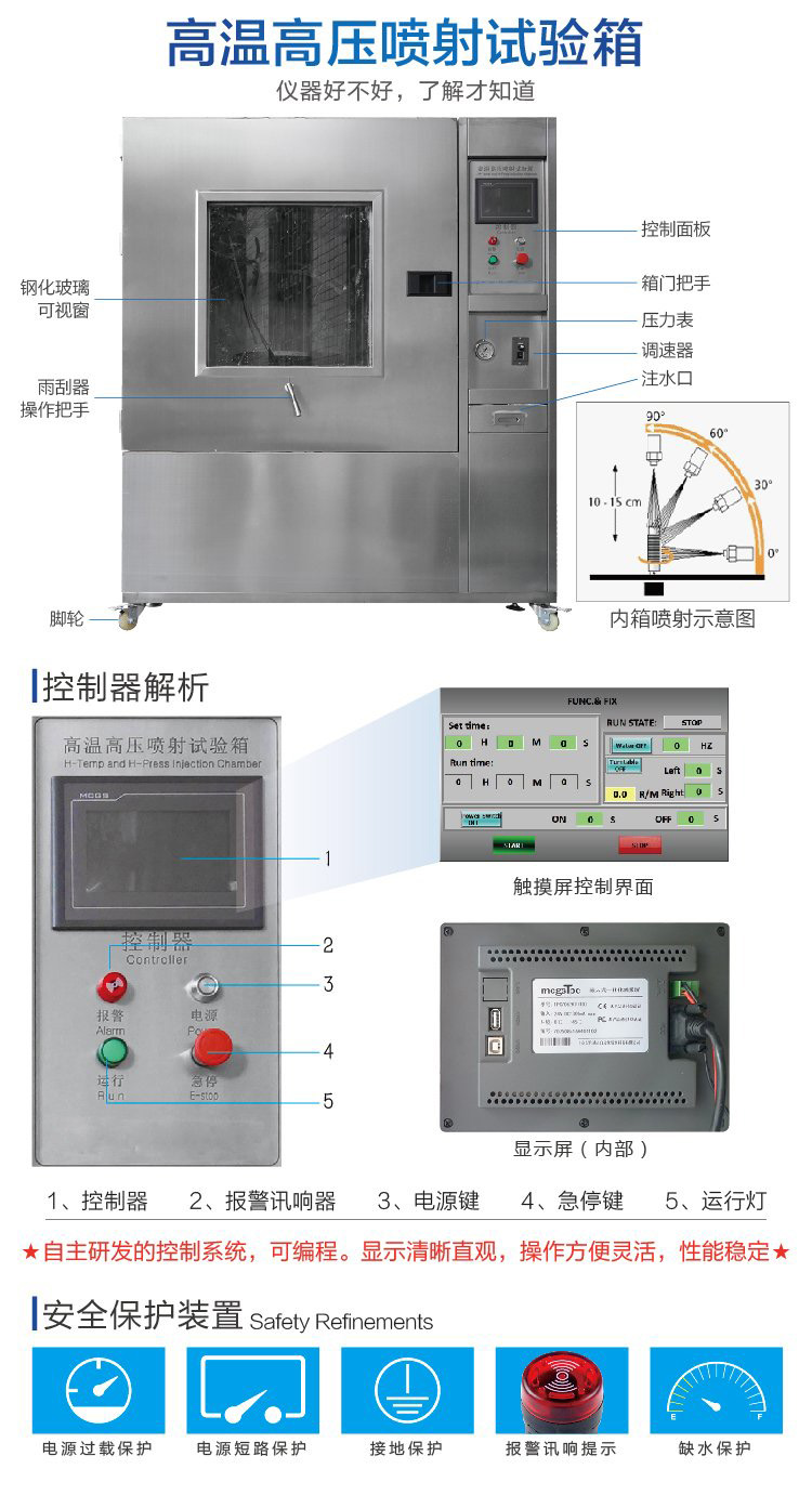 高溫高壓噴射試驗箱適用于考核電工產品,外殼和密封在高溫高壓噴水環境下能否保證設備和元件良好性能的試驗。