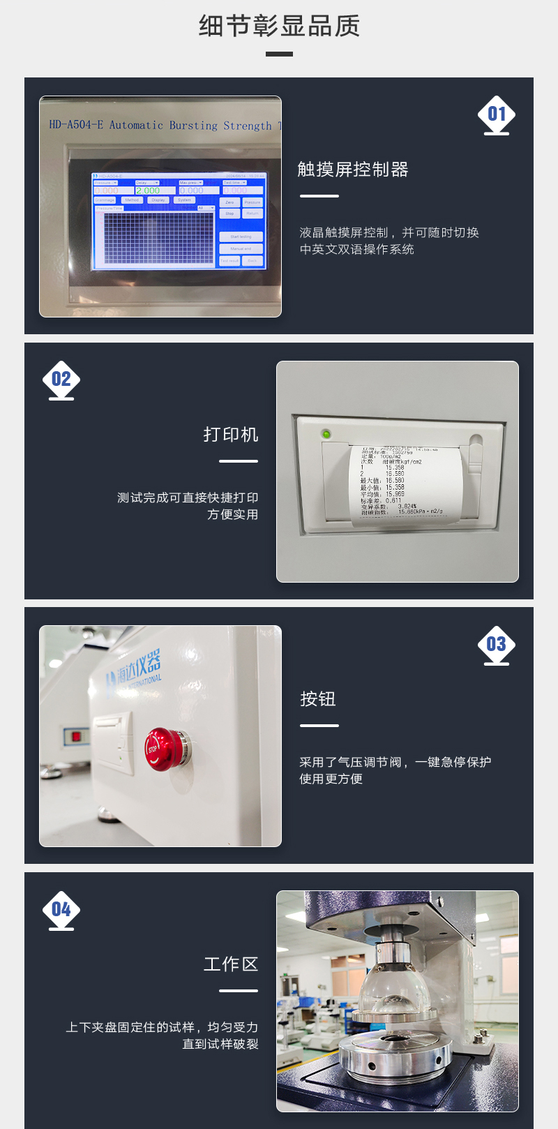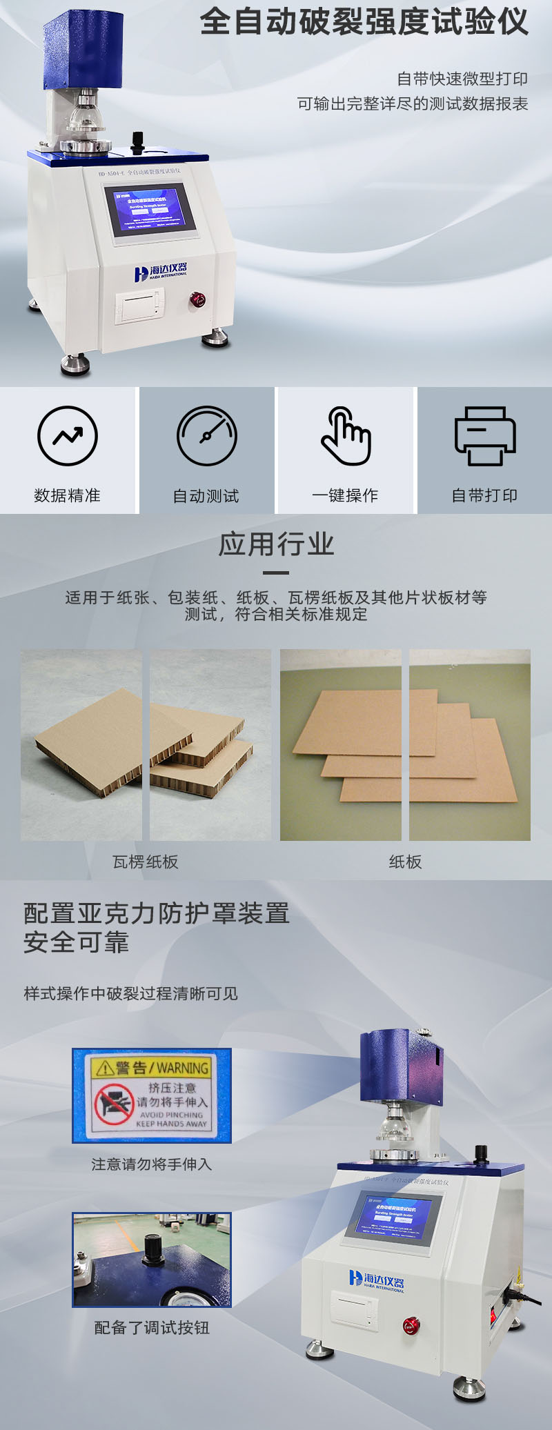 | 主要測(cè)試項(xiàng)目 | 紙板耐破強(qiáng)度測(cè)試、紙張耐破強(qiáng)度測(cè)試(選配) |