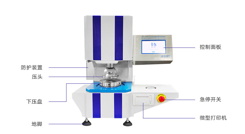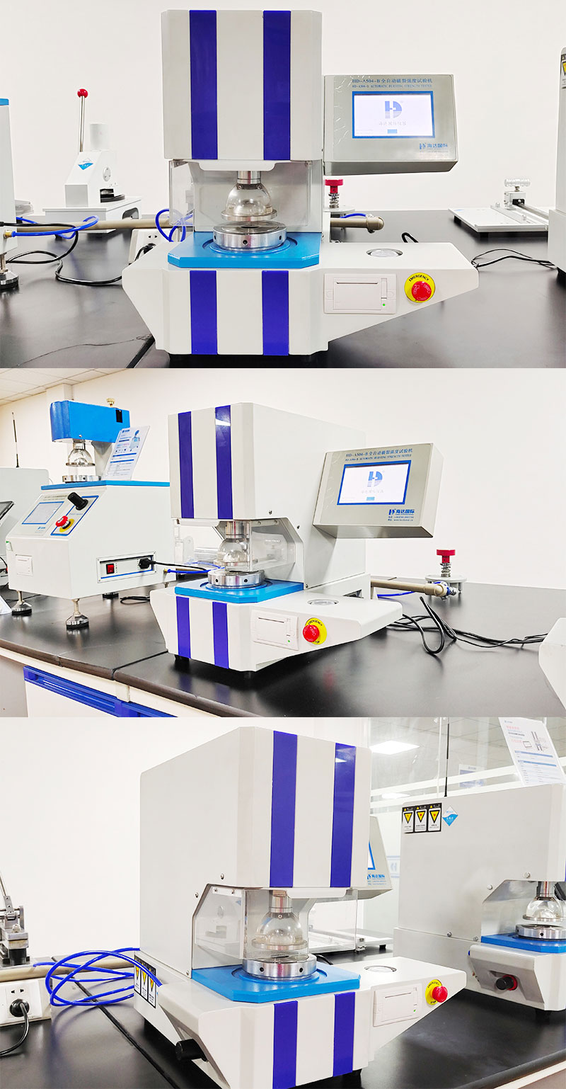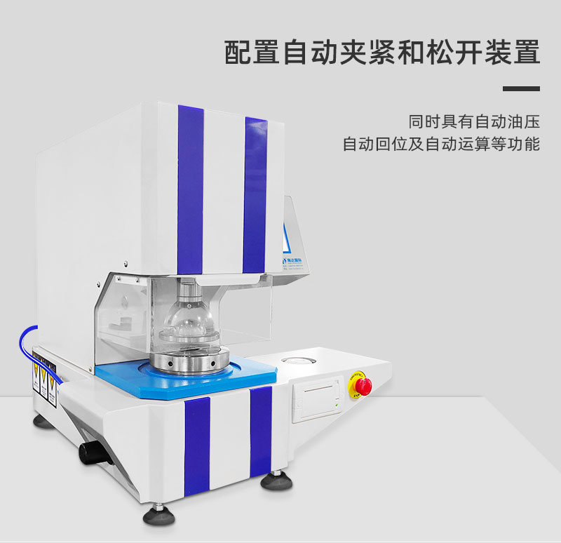 在儀器密封的油缸和壓紙座的容腔內,裝滿甲基硅油作為壓力傳遞的介質,當電機帶動活塞勻速前進時,橡皮膜受到硅油的加壓而突起,此時夾持在膠膜上方,被上下夾盤固定住的試樣,均勻受力,直到試樣破裂,處理芯片鎖住最大壓力值,通過液晶屏顯示該壓力值,此壓力值即為本次試樣的耐破度。
