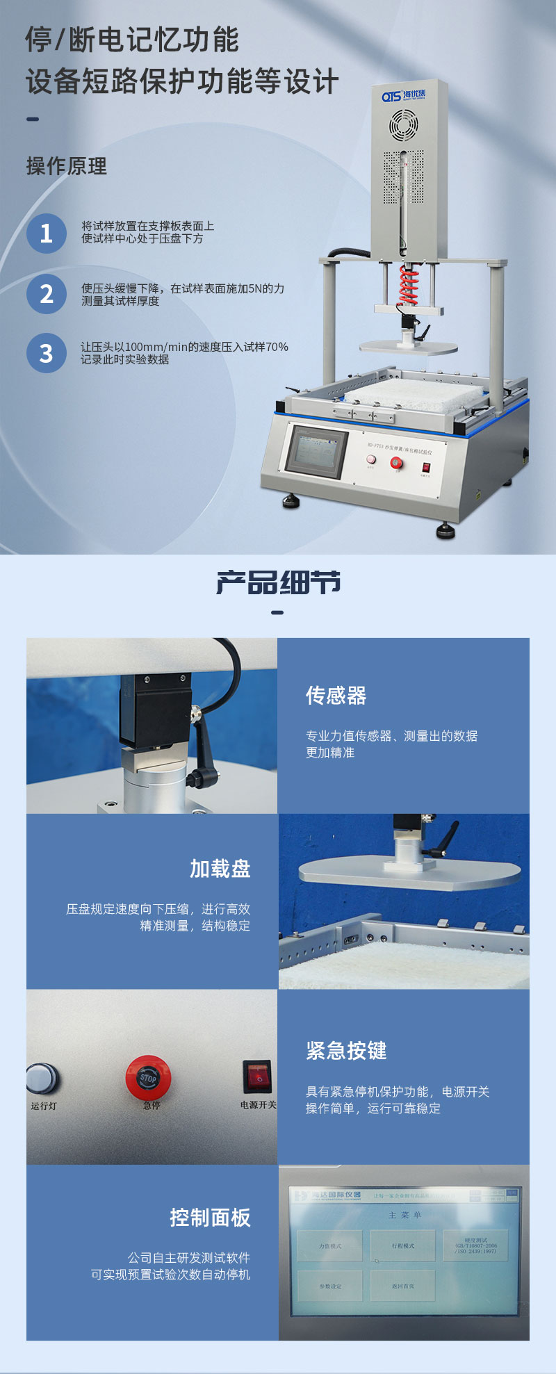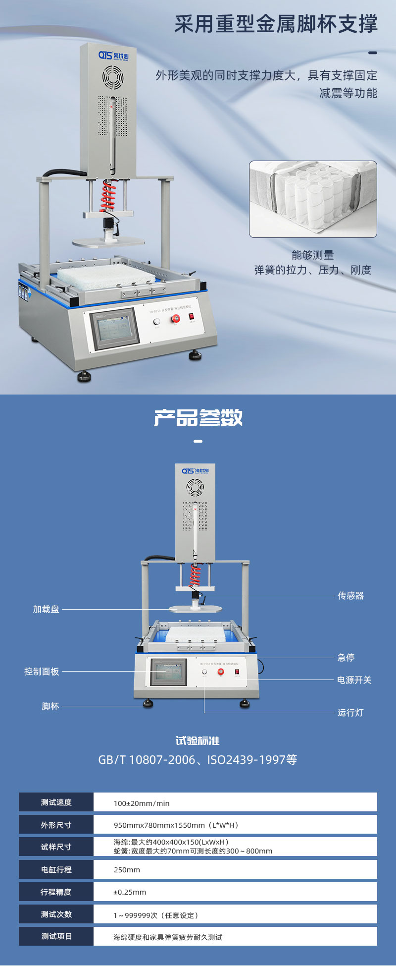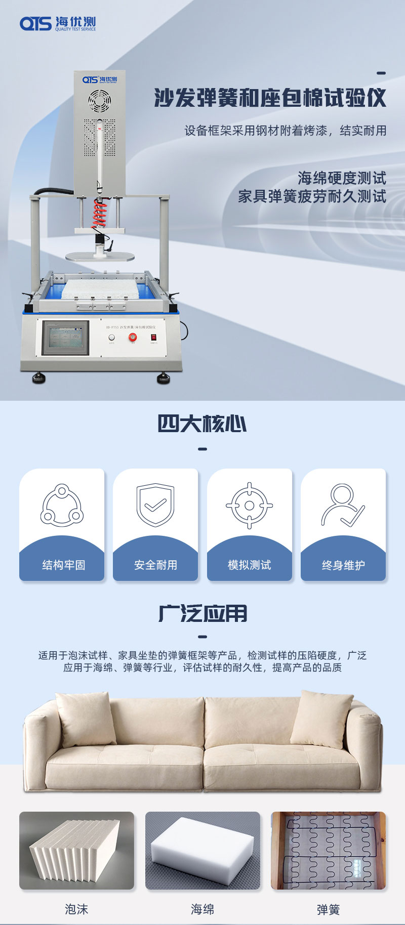 沙發(fā)彈簧座包棉測試儀用于測試沙發(fā)及家具坐墊的彈簧框架及彈簧包和彈簧坐墊的耐久性和承受力。可按預(yù)設(shè)定之壓力條件進(jìn)行重復(fù)按壓測試,周期可預(yù)設(shè)定,到數(shù)自動停止。