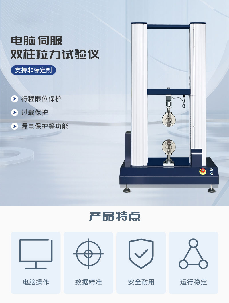 腦伺服式多功能拉力試驗機適用于各種材料、半成品及成品,主要測試其抗拉強度、抗壓強度及伸長量,可做拉伸、剝離、撕裂、熱封、抗彎、抗折、壓縮、?粘合等性能測試