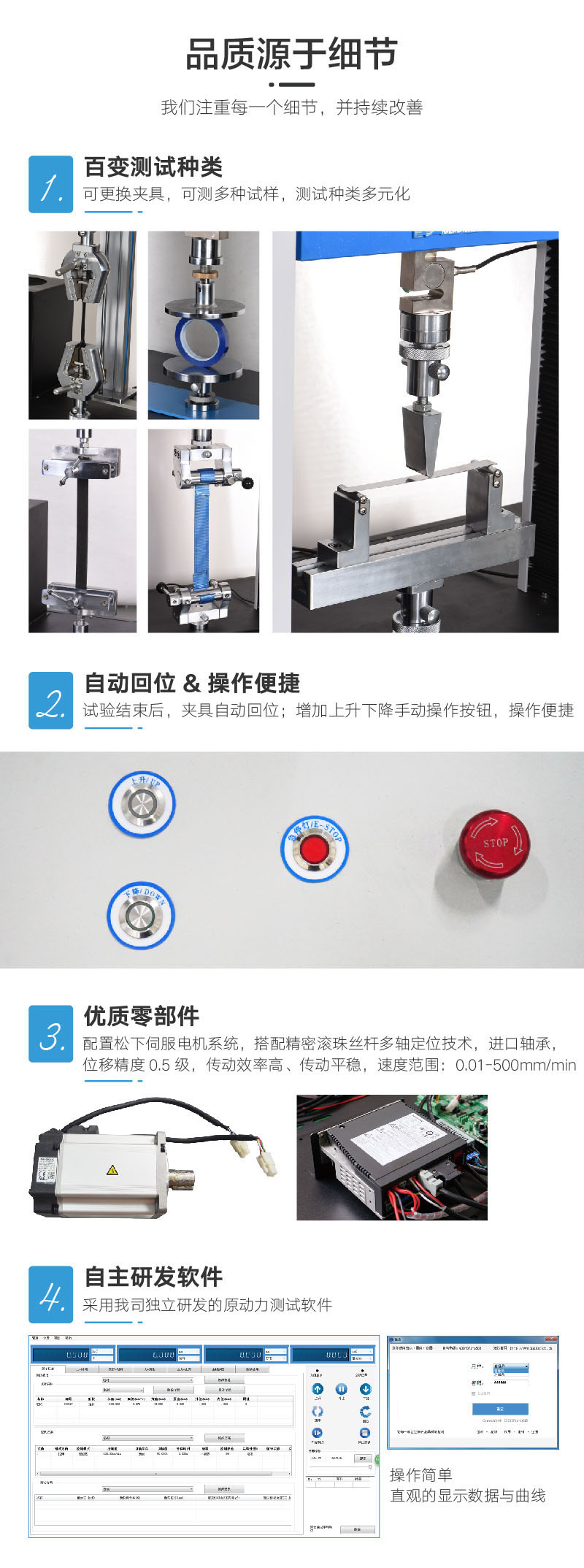 電腦伺服雙柱拉力機(jī)廣泛應(yīng)用于各類五金、金屬、橡塑料、鞋業(yè)、皮革、服裝、紡織、絕緣體、電線電纜、端子等各類材料,測(cè)試其拉伸、撕裂、剝離、抗壓、彎曲抗剪力、三點(diǎn)抗折……等各項(xiàng)物性測(cè)試性能。