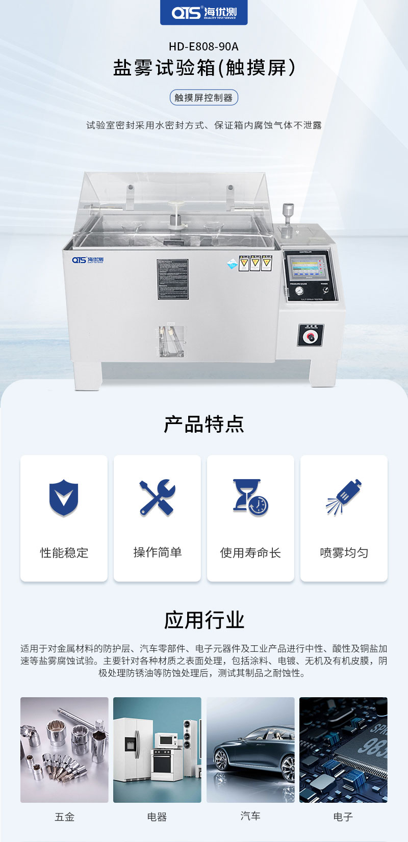 鹽霧試驗機(觸摸屏式)通過考核對材料及其防護層的鹽霧腐蝕的能力,以及相似防護層的工藝質量比較,同時可考核某些產品抗鹽霧腐蝕的能力;該產品適用于零部件、電子元件、金屬材料的防護層以及工業產品的鹽霧腐蝕試驗。