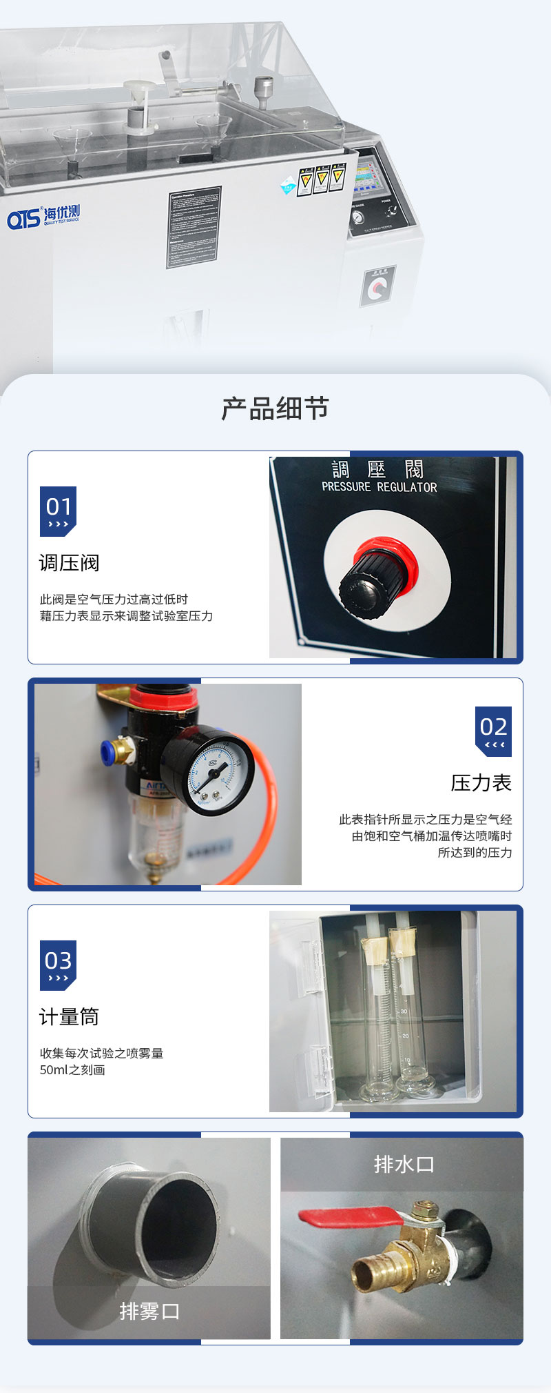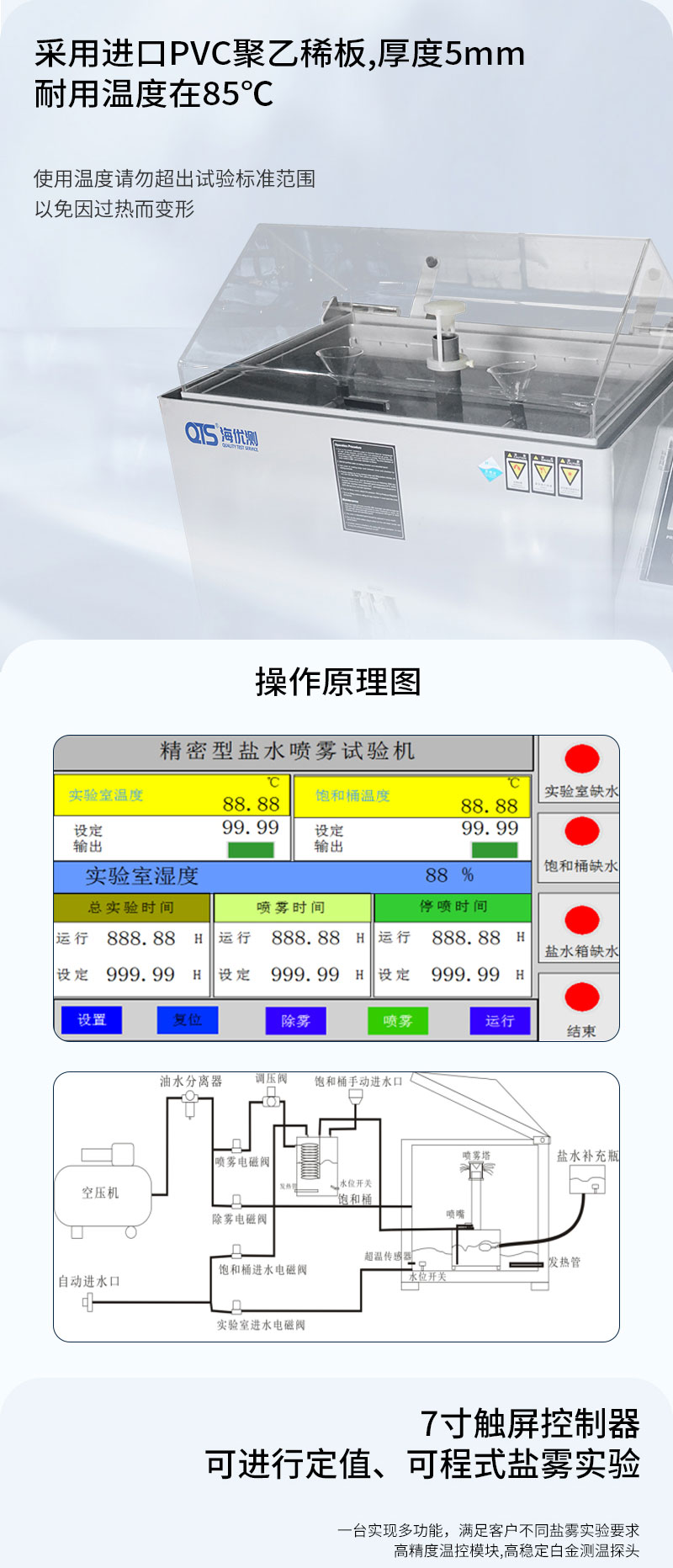 鹽霧試驗機(觸摸屏式)通過考核對材料及其防護層的鹽霧腐蝕的能力,同時可考核某些產品抗鹽霧腐蝕的能力;該產品適用于零部件、電子元件、金屬材料的防護層以及工業產品的鹽霧試驗。