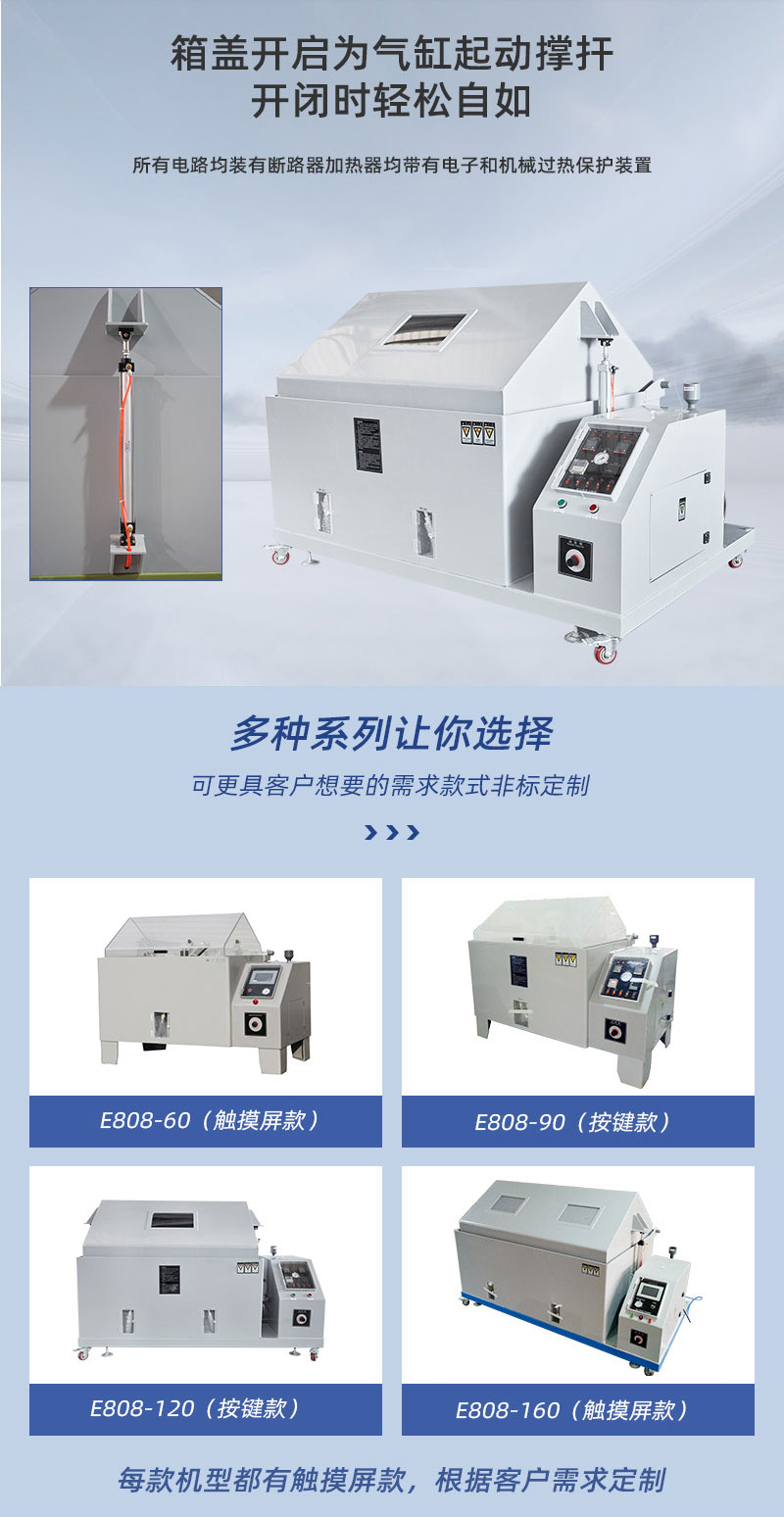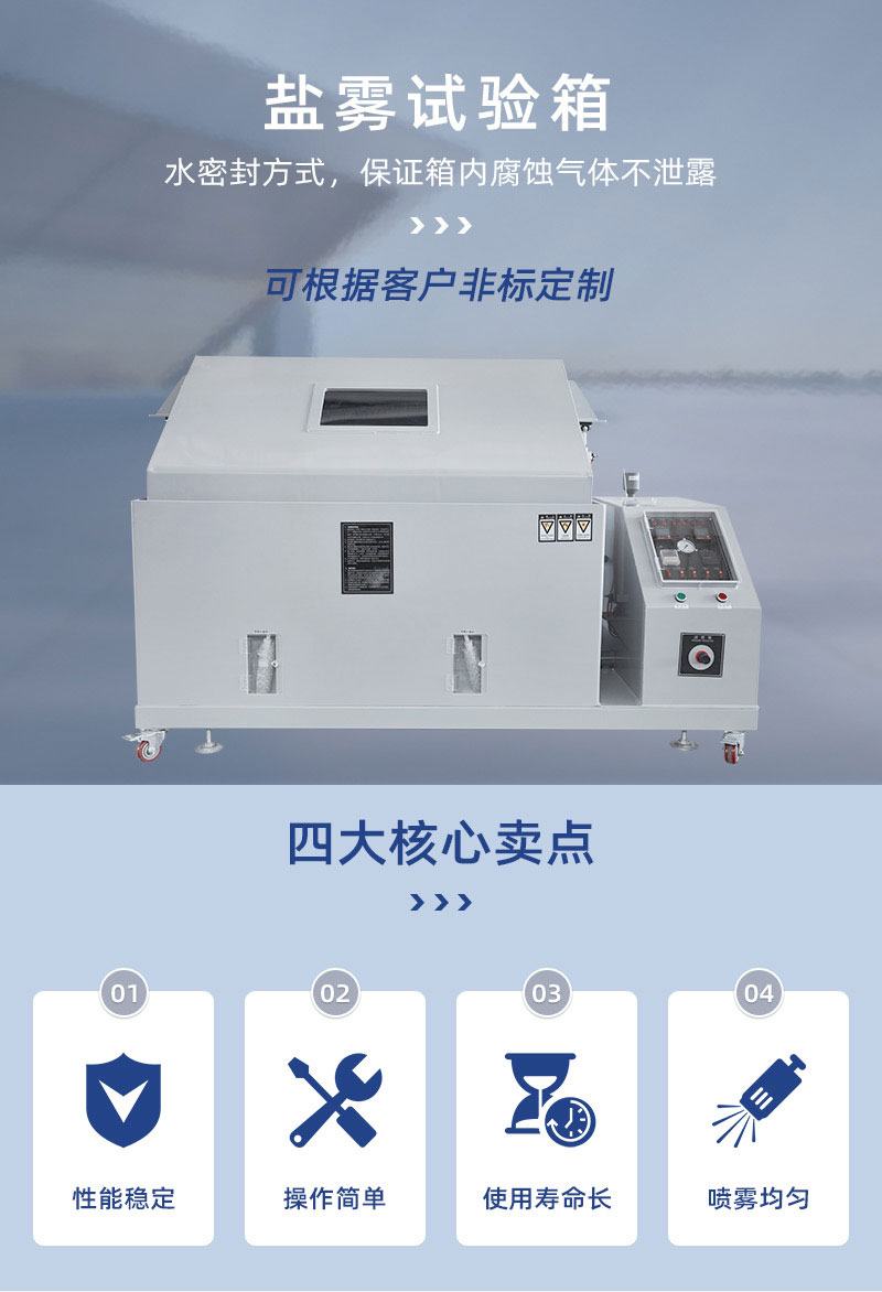 鹽霧試驗箱(按鍵式)可進行中性、酸性及銅鹽加速等鹽霧腐蝕試驗。主要針對各種材質之表面處理,包括涂料、電鍍、無機及有機皮膜,陰極處理防銹油等防蝕處理后,測試其制品之耐蝕性。