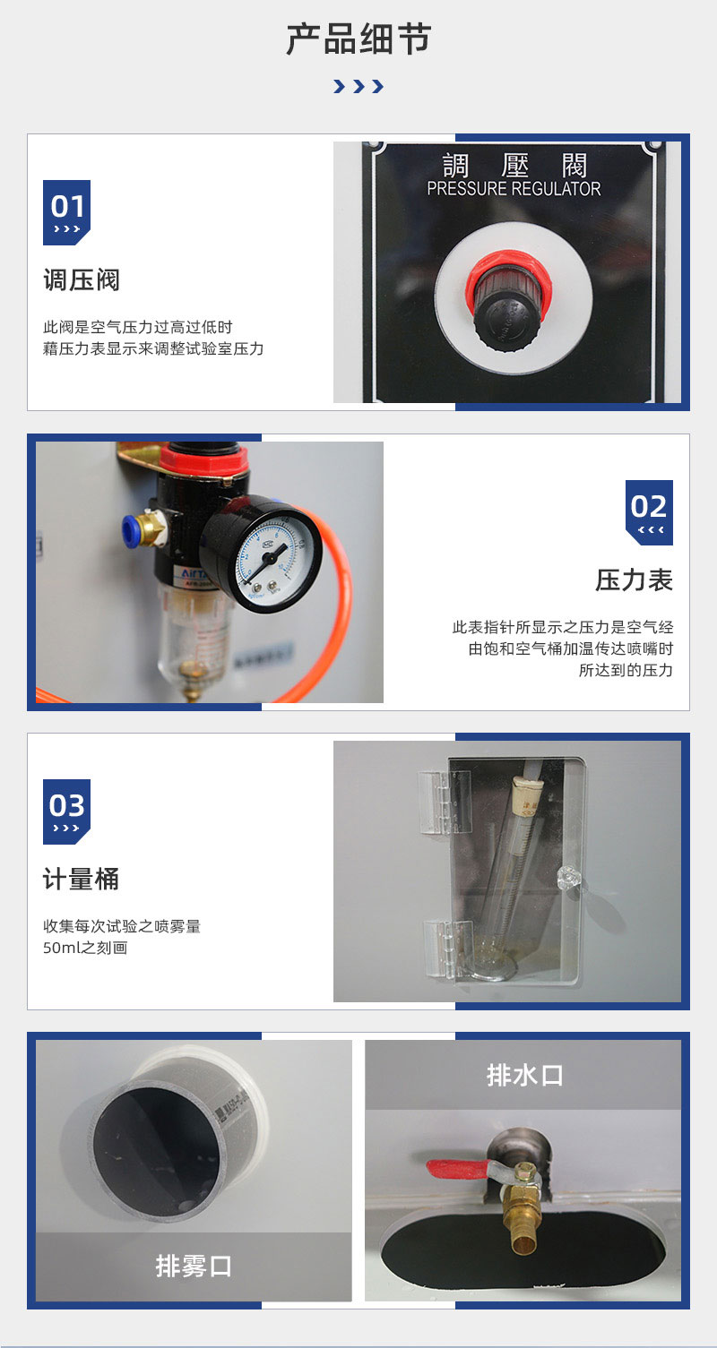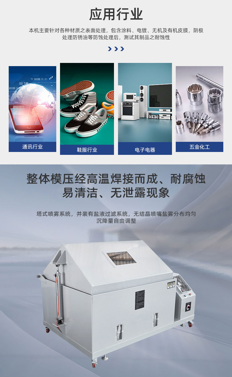 鹽霧試驗箱(按鍵式)適用于鹽霧腐蝕的方式來檢測被測樣品的分別耐腐蝕的可靠性,是人工氣候環境“三防”(濕熱、鹽霧、霉菌)試驗設備之一,各種環境適應可靠性的一種重要試驗設備。適用于對金屬材料的防護層、汽車零部件、電子元器件及工業產品進行中性、酸性及銅鹽加速等鹽霧腐蝕試驗。主要針對各種材質之表面處理,包括涂料、電鍍、無機及有機皮膜,陰極處理防銹油等防蝕處理后,測試其制品之耐蝕性。