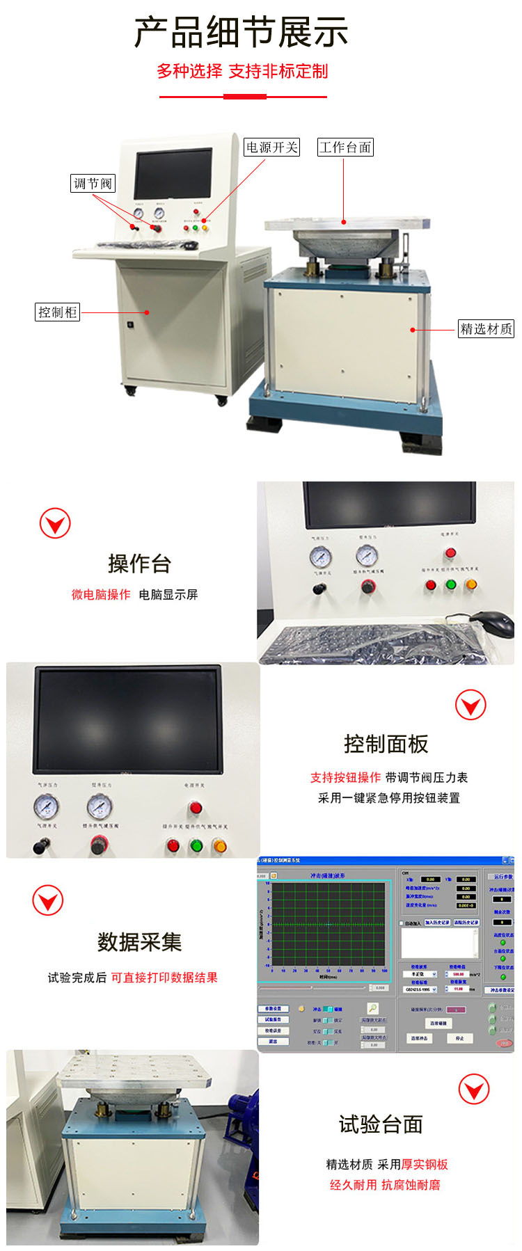沖擊碰撞試驗(yàn)機(jī)/電池產(chǎn)品碰撞實(shí)驗(yàn)機(jī)的工作平臺(tái)剛性高,臺(tái)面峰值加速度均勻度佳。系統(tǒng)可靠度高,保護(hù)功能完整。可擴(kuò)充后峰鋸齒波及梯形波等沖擊波形。完成沖擊碰撞兩種試驗(yàn)。碰撞試驗(yàn)加速度閉環(huán)控制,控制精度高。