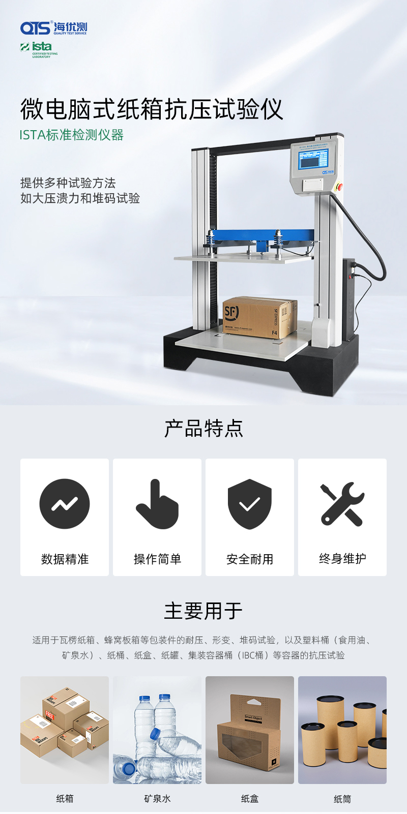 微電腦式紙箱抗壓儀是檢驗紙箱或其它包裝容器耐壓強度的測試儀器,用于判定紙箱的抗壓能力,并可做持壓堆碼的測試。適用于瓦楞紙箱、蜂窩板箱等包裝件的耐壓、形變、堆碼試驗。并兼顧塑料桶(食用油、礦泉水)、紙桶、紙盒、紙罐、集裝容器桶(IBC桶)等容器的抗壓試驗。