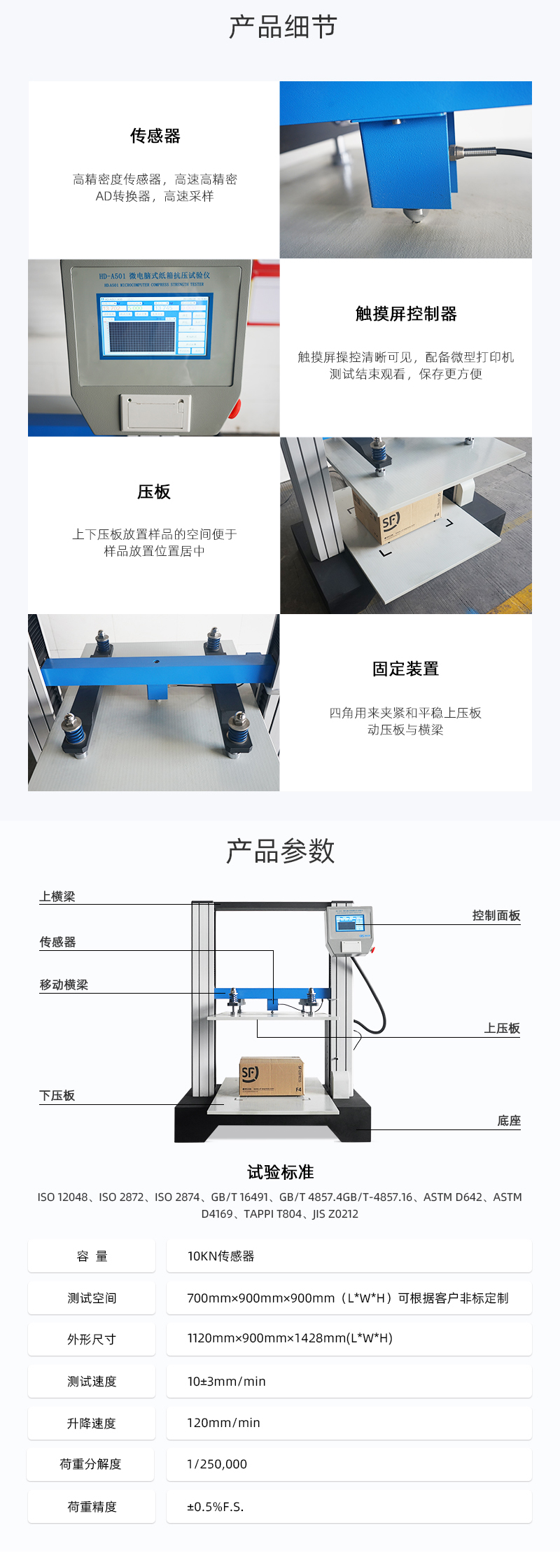 微電腦式紙箱抗壓儀是檢驗紙箱或其它包裝容器耐壓強度的測試儀器,用于判定紙箱的抗壓能力,并可做持壓堆碼的測試。適用于瓦楞紙箱、蜂窩板箱等包裝件的耐壓、形變、堆碼試驗。