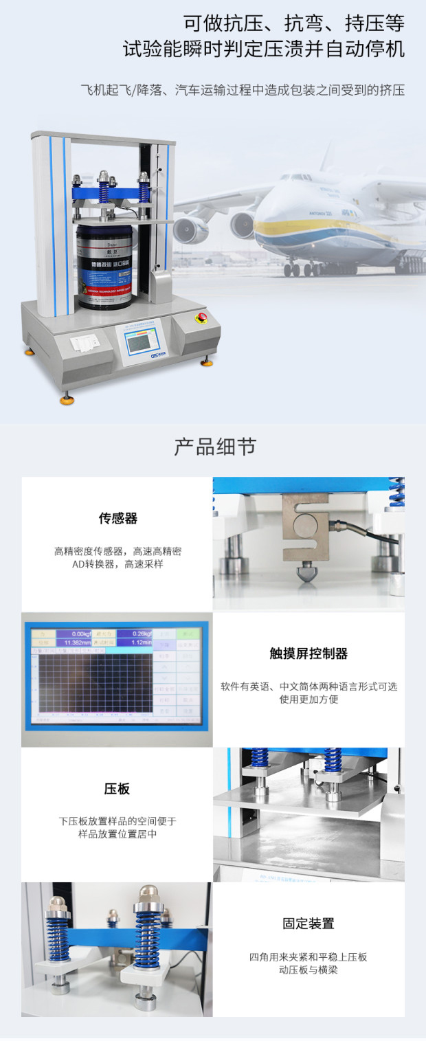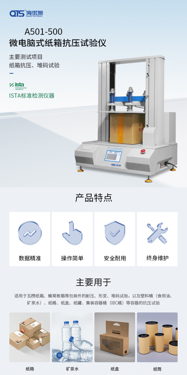 微電腦式紙箱抗壓儀是檢驗紙箱或其它包裝容器耐壓強度的測試儀器,用于判定紙箱的抗壓能力,并可做持壓堆碼的測試。適用于瓦楞紙箱、蜂窩板箱等包裝件的耐壓、形變、堆碼試驗。