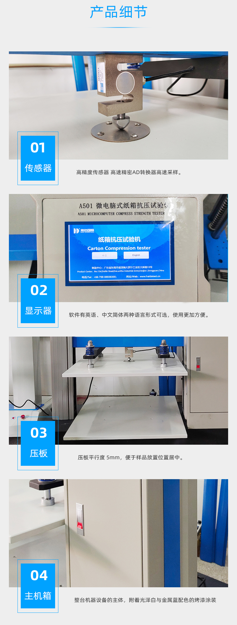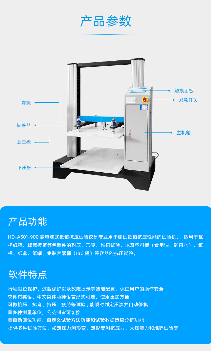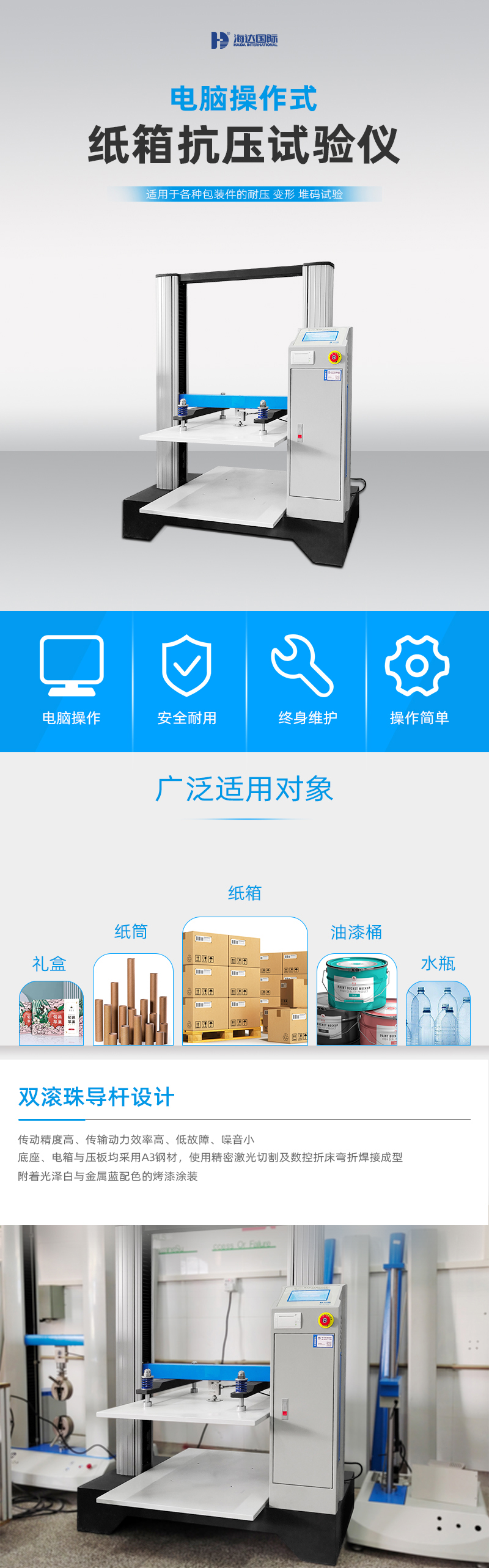 微電腦式紙箱抗壓試驗機是檢驗紙箱或其它包裝容器耐壓強度的測試儀器,用于判定紙箱的抗壓能力,并可做持壓堆碼的測試,適用于瓦楞紙箱、蜂窩板箱等包裝件的耐壓、形變、堆碼試驗。