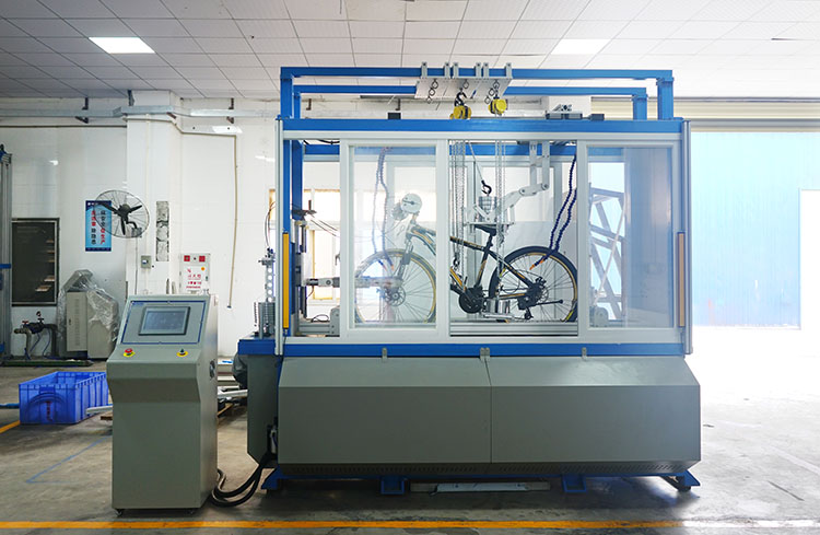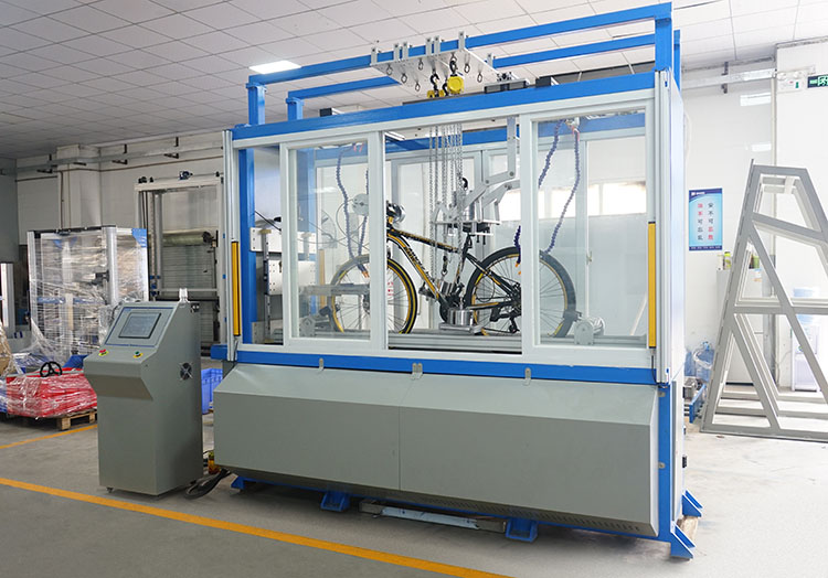 本機適用于自行車的道路動態(tài)試驗及制動性能試驗,參照DIN79100、EN14764、EN14765、EN14766、EN14718標(biāo)準(zhǔn)制作,機臺模擬路面由兩個滾輪組成,按試驗要求在車底座、踏板、把手、貨架上各裝載荷重后固定于試驗機上,通過道路動態(tài)試驗來模擬自行車在路面的行駛過程,從而檢測自行車性能,也可以通過制動性能試驗來測試自行車手剎的性能。