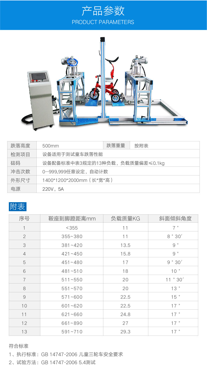 | 主要測試項目 | 測試各類兒童三輪車等的抗跌落沖擊損壞的能力 |