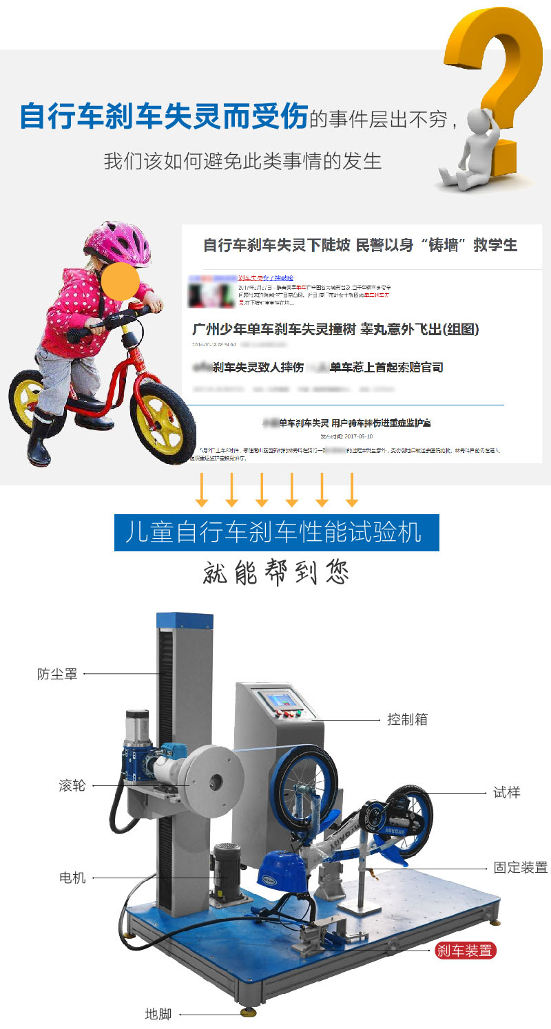 該設備用于測試手閘制動力,于驅動輪上纏繞一圈半帶子,在被測閘把末端25mm處施加一50~90N力,拉轉帶子轉動一圈半,當車輪的線速度達到0 5m s至2m s時,再拉轉一圈,記錄其平均制動力。